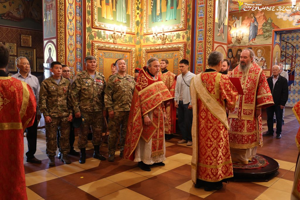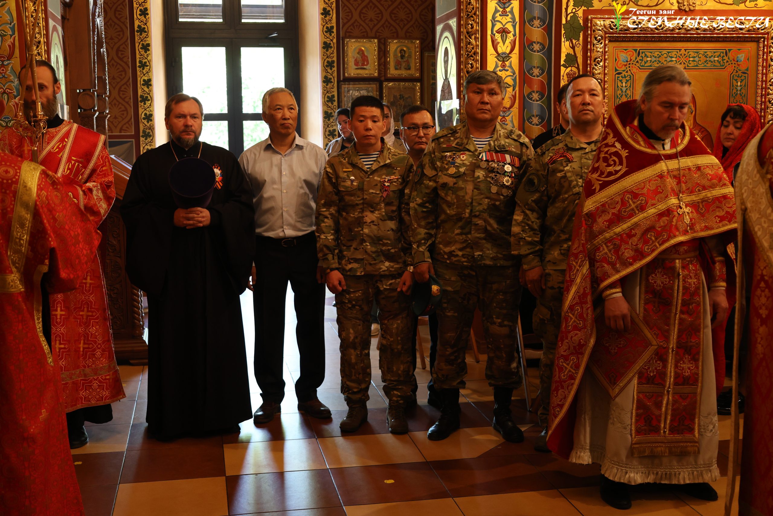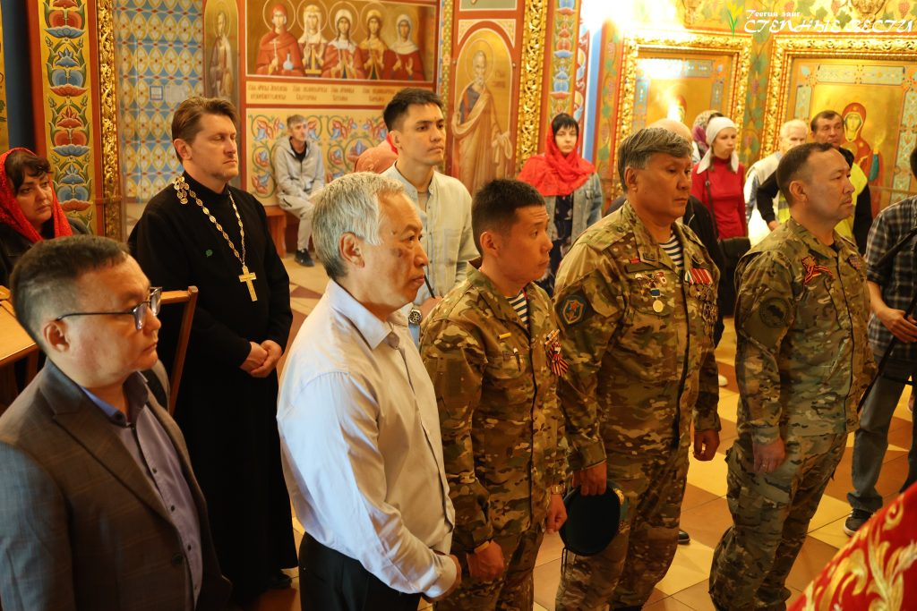 На богослужении присутствовали ветераны СВО Владимир и Пюрвя Манджиевы, Арслан Одгаев и председатель Общественной палаты Калмыкии Батыр Мучаев с коллегами.