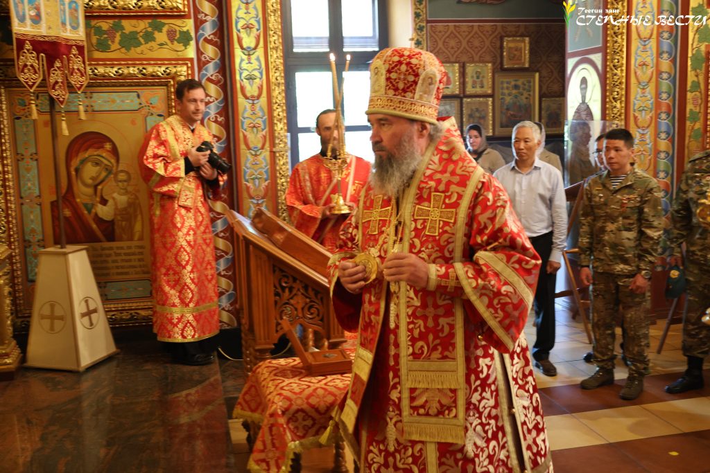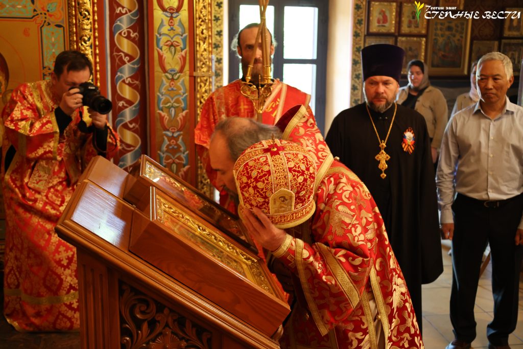 Божественную литургию в честь покровителя воинов провел архиепископ Элистинский и Калмыцкий Юстиниан. «Мы знаем о чудесах, которые святой Георгий совершил при земной жизни, но больше имеем свидетельств о его помощи и заступничестве после мученической кончины. Сейчас нам с вами особенно нужны сила воли, крепость духа, ясность мысли и поддержка Георгия Победоносца, – отметил архиепископ в своей проповеди. – В преддверии Дня Победы, совершенной нашими дедами и прадедами, вспоминаем, что к празднику в честь святого Георгия основные боевые действия Великой Отечественной войны были уже закончены, и все ожидали подписания капитуляции Германии. Торжество Воскресения Христова, память Георгия Победоносца и победа нашего народа над нацистской Германией и ее союзниками – как все чудесно соединилось!».