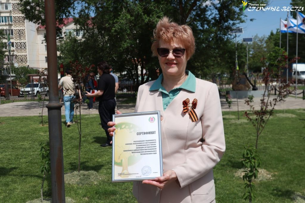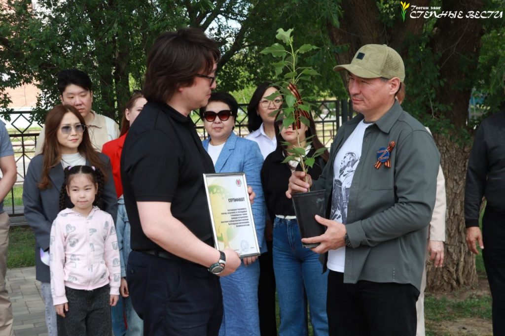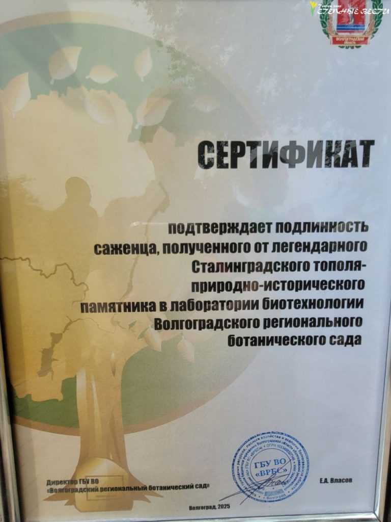 После он передал сертификат, подтверждающий подлинность саженца, полученного от природно-исторического памятника, руководителю администрации Элисты Алдару Лиджикову. В документе отмечено, что саженец получен в лаборатории биотехнологии Волгоградского регионального ботанического сада.