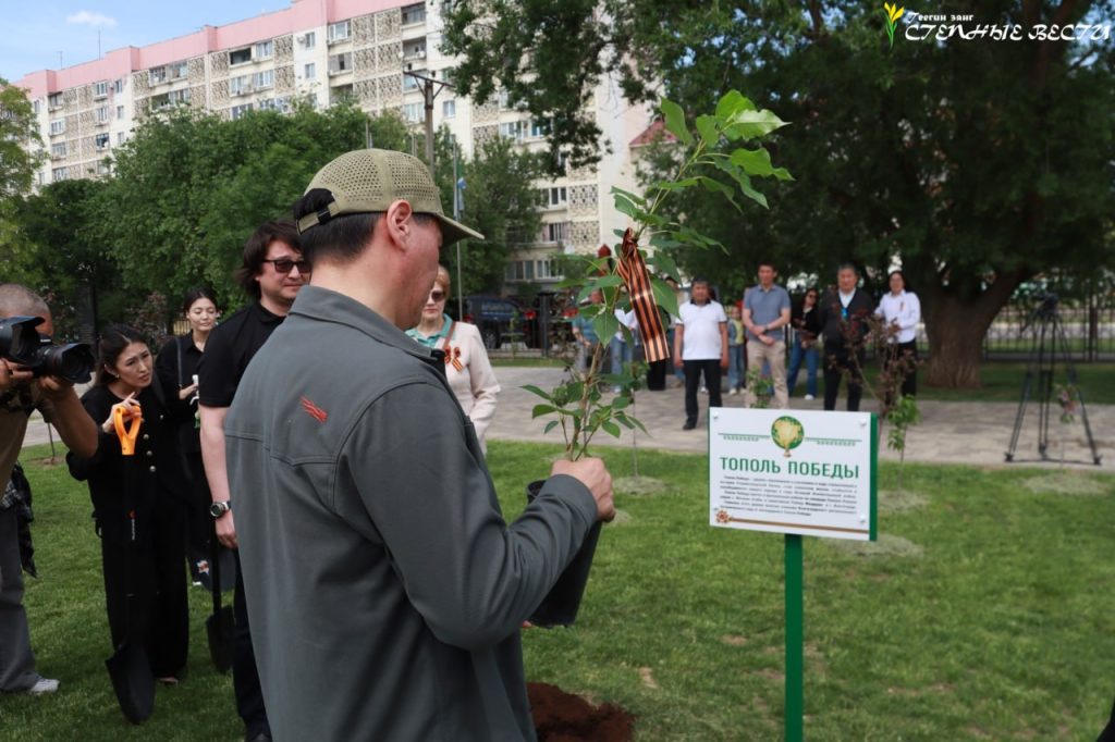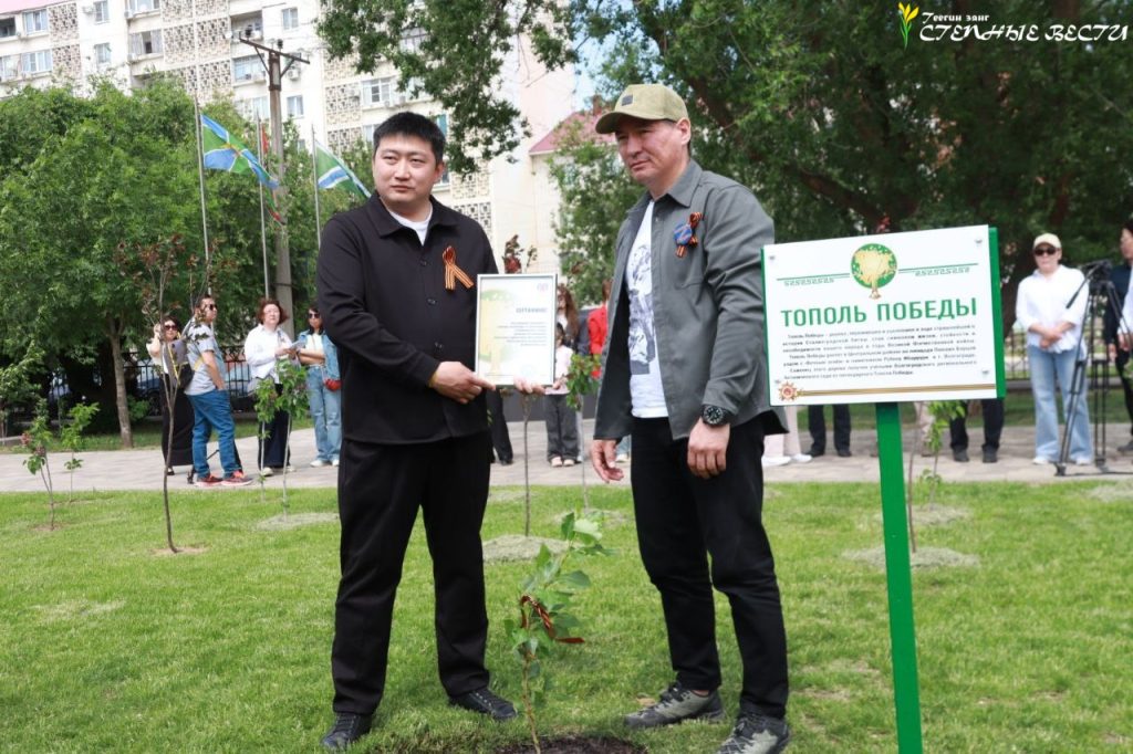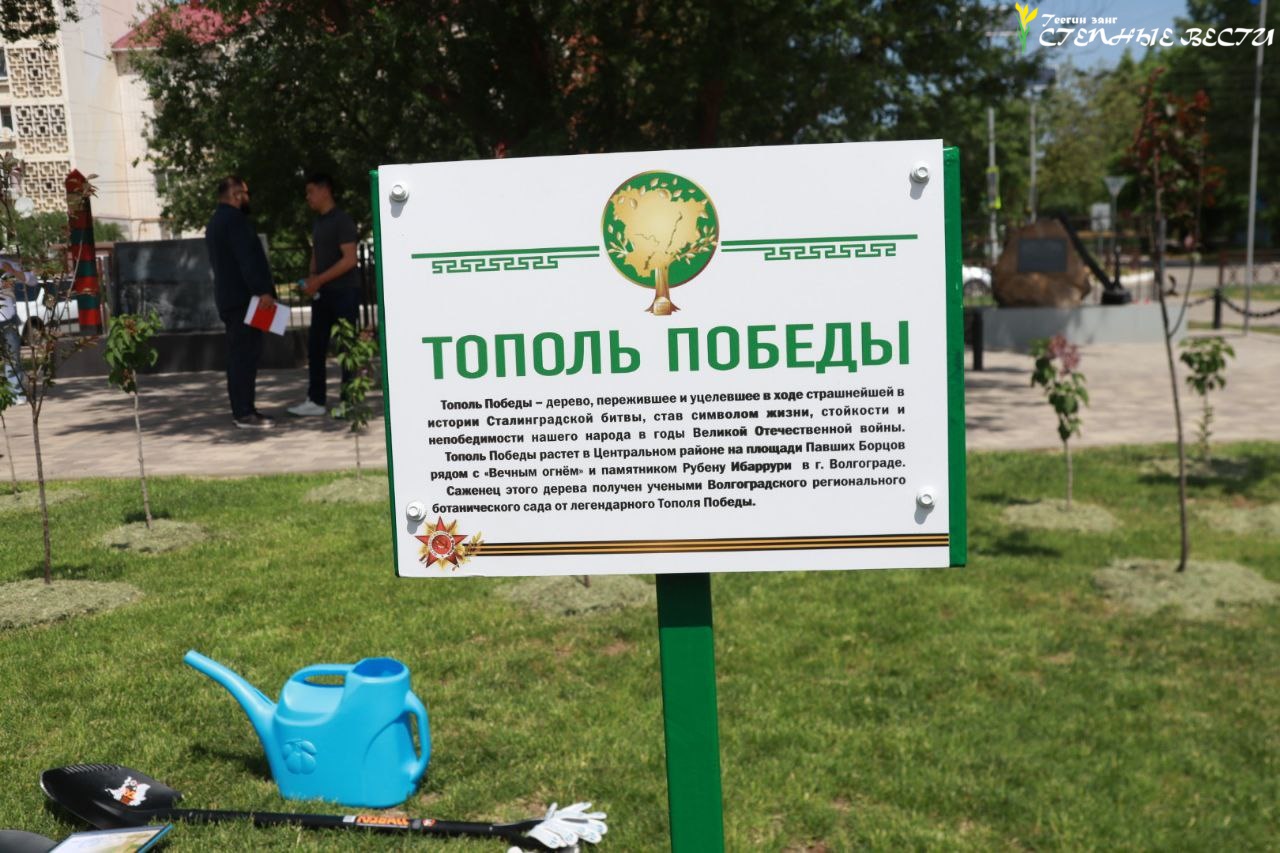 В Элистинском парке Победы Глава Калмыкии Бату Хасиков посадил росток легендарного дерева. Тополь Победы — это дерево, которое находится в Волгограде на площади Павших борцов. Оно стало живым участником и свидетелем ожесточенных боев Сталинградской битвы. Весной 1943 года маленькое деревце нашли при разборе обломков, а в 2013-м специалисты прорастили его почки.