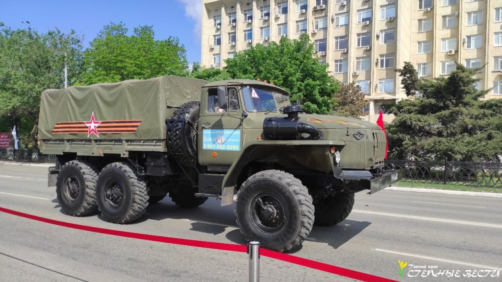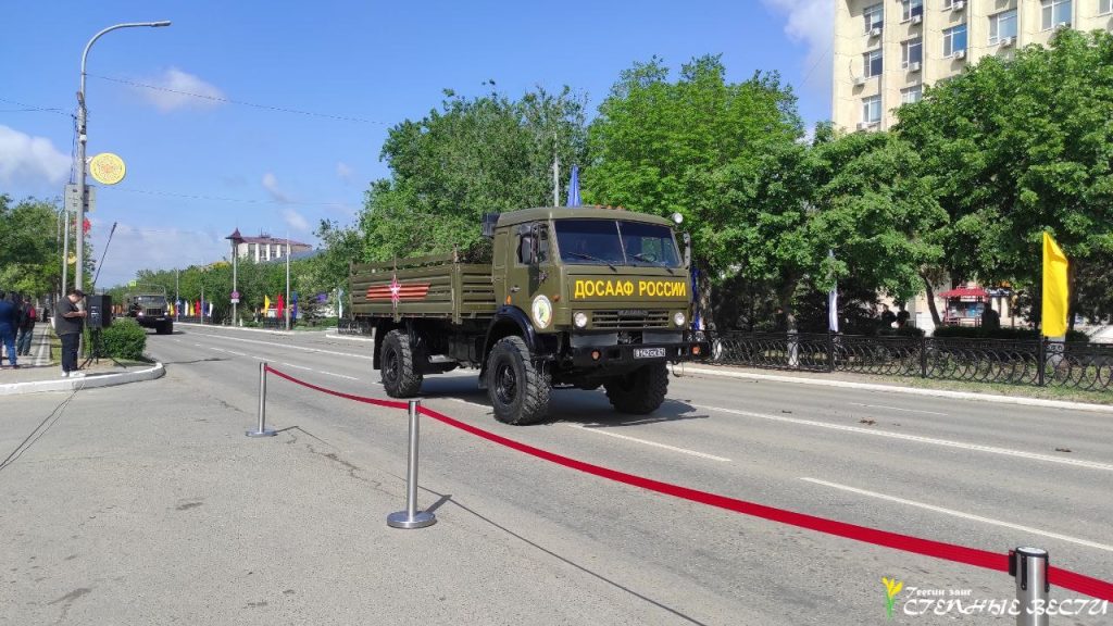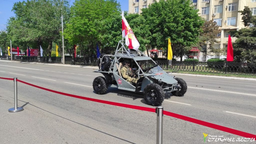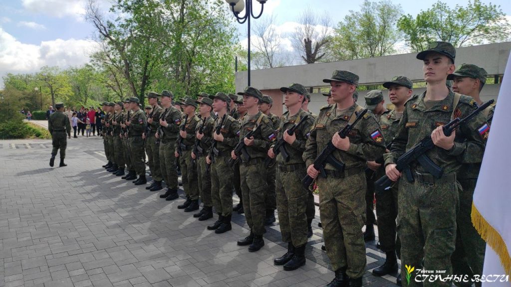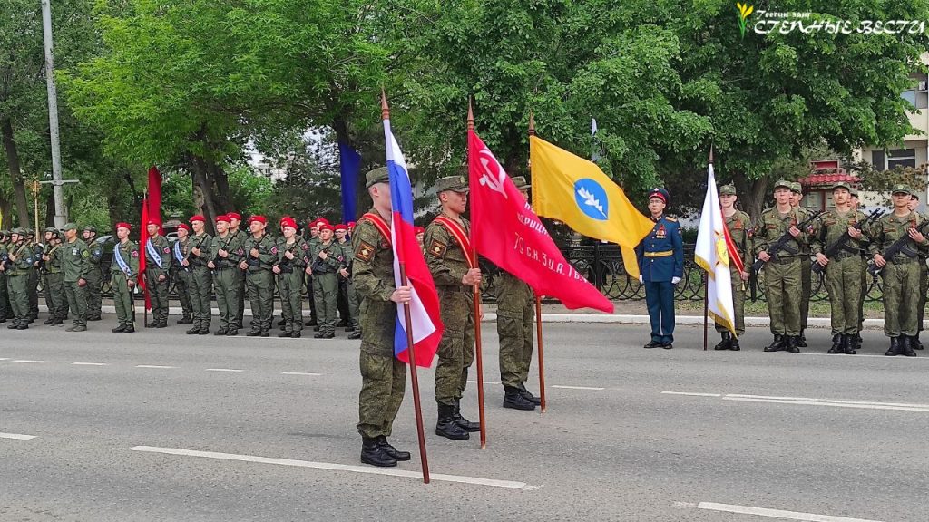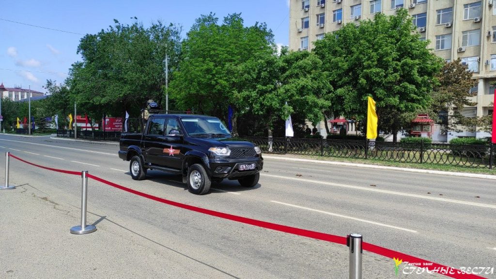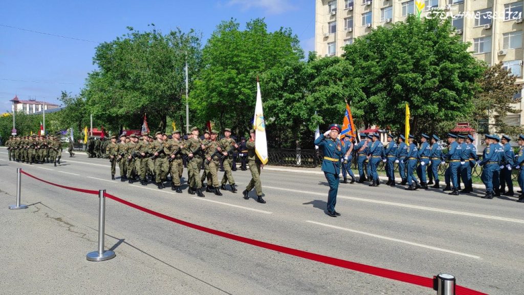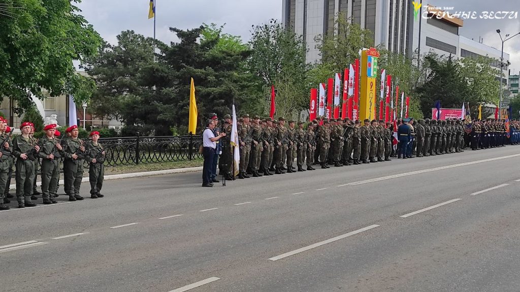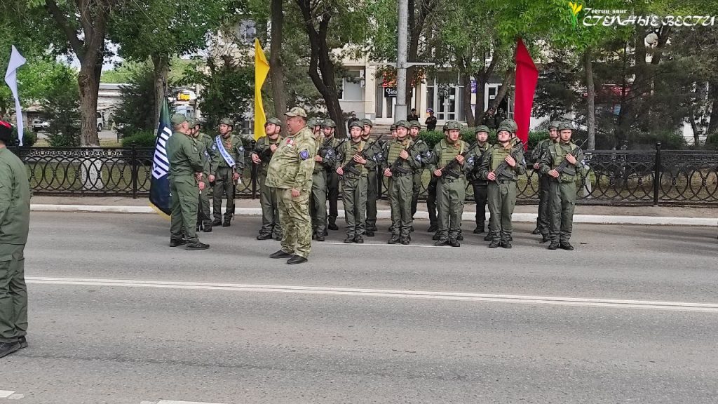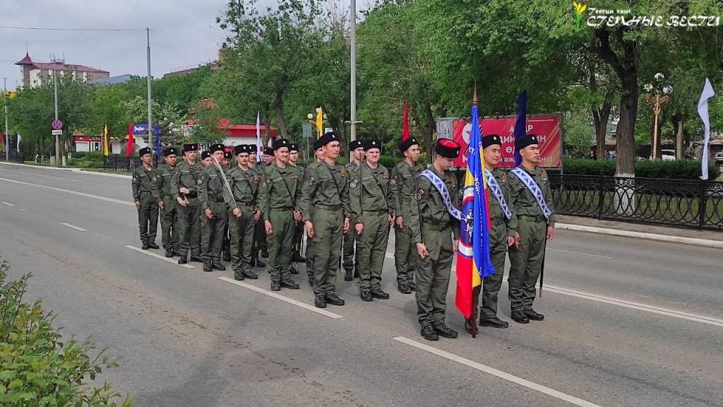 Под музыку военных маршей по главной улице Элисты прошли парадные расчеты и колонна военной техники МВД, Росгвардии, МЧС, УФСИН, Казачьего кадетского корпуса имени О. И. Городовикова, военного учебного центра Калмыцкого госуниверситета имени Б. Б. Городовикова, курсанты филиала центра «Воин» и активисты «Юнармии».