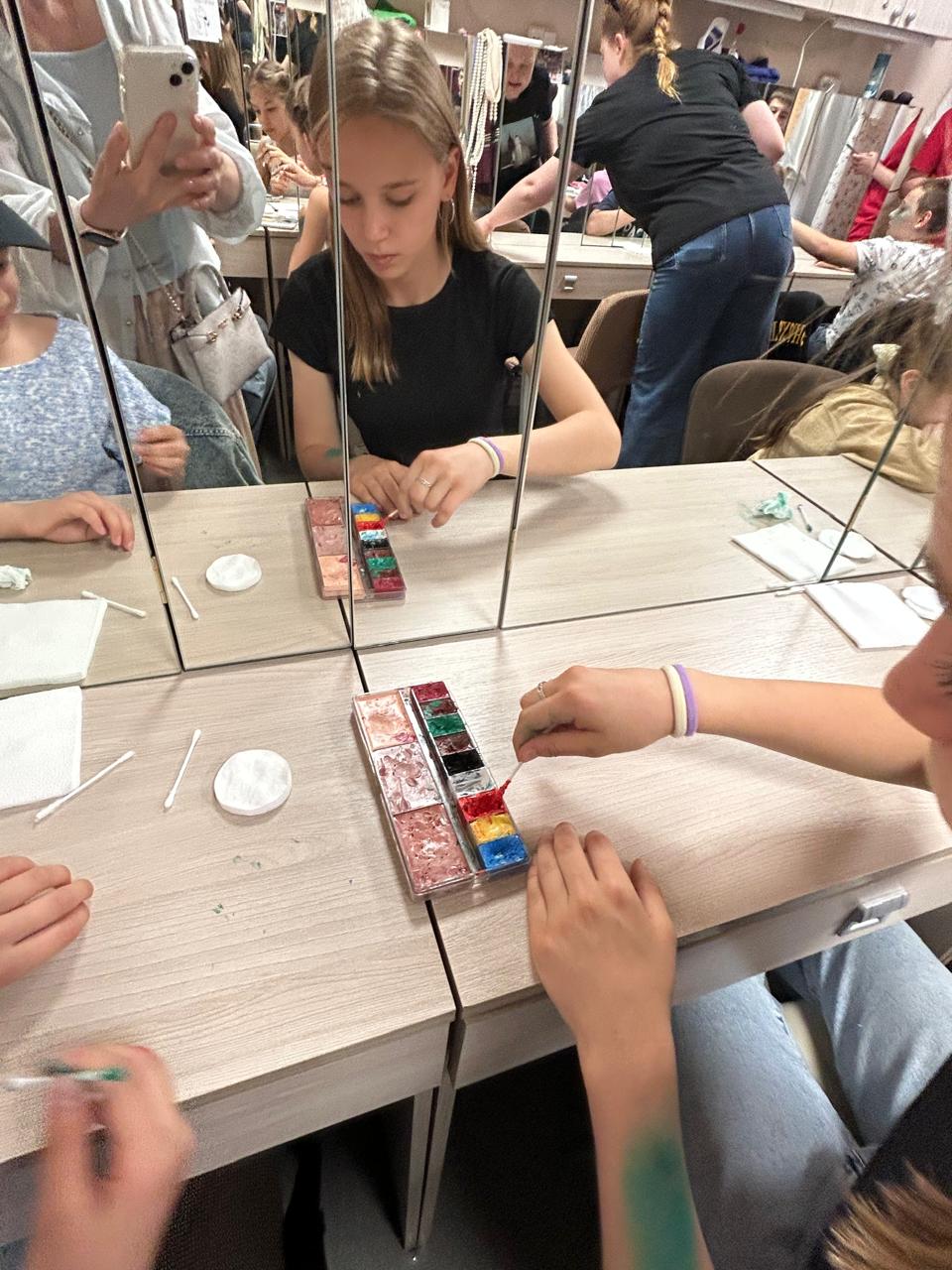 А в русском театре ребята посмотрели прекрасную добрую сказку «Золушка», и еще им провели увлекательную экскурсию по залам театра, мастер-классы с актерами. Мы были в гримерной, и нам открыли нюансы работы с театральным гримом.