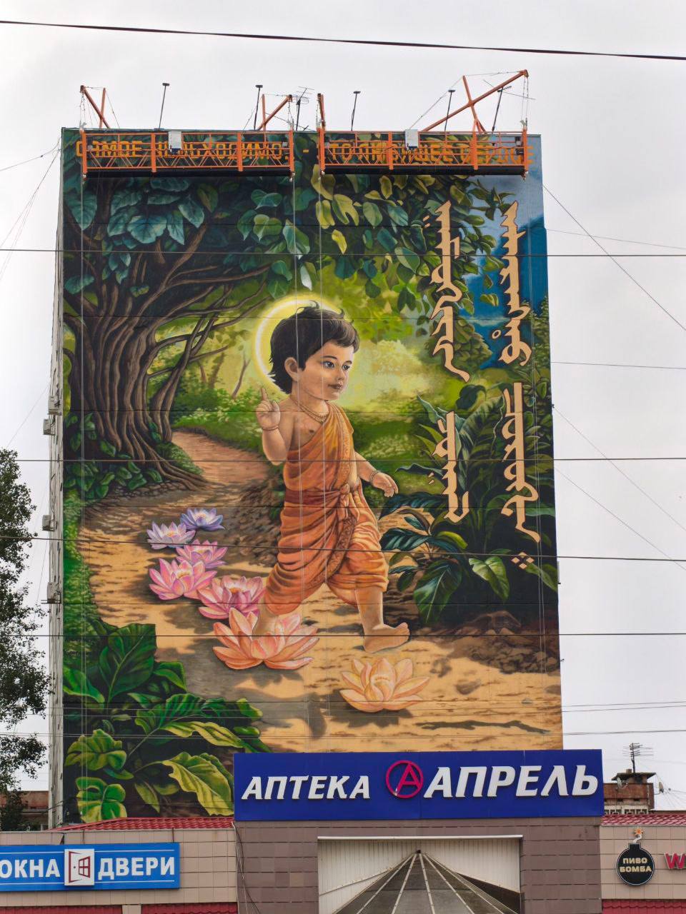 Новый мурал отражает первое деяние — рождение Будды. Он создавался в рамках подготовки к III международному буддийскому форуму.
