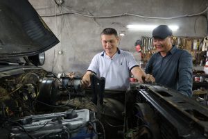 В гараже мы застали и лейтенанта Андрея Чимидова (позывной «Ферзь 08»), навестившего друзей во время отпуска. Он приехал на автомобиле УАЗ «Патриот», переданном из этой автомастерской. «Мне нужна была машина именно такого плана, она помогает в любую погоду, в любых условиях доставить в нужное место боекомплект и провизию. Автомобиль передали мои друзья детства, и он служит мне более полугода. Я приехал на нем в отпуск, сейчас ребята еще кое-что доработают под мои задачи, продумывают защиту. Мы все из Юстинского района, из Татала. Церен – мой брат двоюродный. Нас три человека из одного села с орденами Мужества», – отметил Андрей Чимидов.
