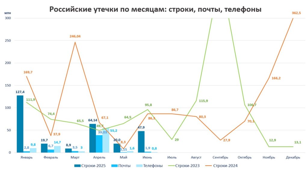 В первой половине 2025 года эксперты Solar AURA зафиксировали 289 млн утекших строк данных, в то время как в аналогичном периоде прошлого года показатель составлял 626 млн. Среди данных, попавших в открытый доступ, — 54 млн адресов электронной почты и 85 млн телефонных номеров. При этом объем похищенных данных вырос почти в 200 раз — с 3,5 Тб до 687 Тб. Параллельно с этим Solar AURA ежедневно фиксирует от двух до пяти случаев сообщений об утечках в Рунете.