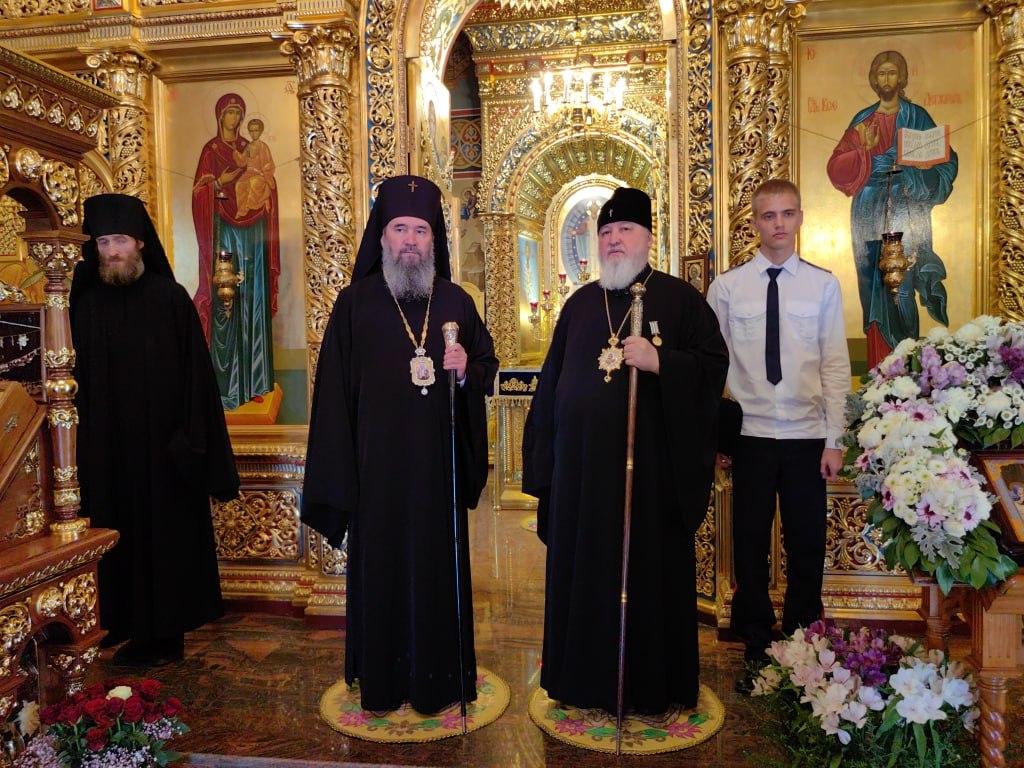 Митрополит Кирилл осмотрел святыни Казанского собора и Крестовоздвиженской церкви: чтимую икону «Неопалимая Купина» и образ «Явления Господа Иисуса Христа верующим Элисты в 1946 году». Высокопреосвященный Кирилл и архиепископ Юстиниан приложились к иконам и поставили перед ними свечи.