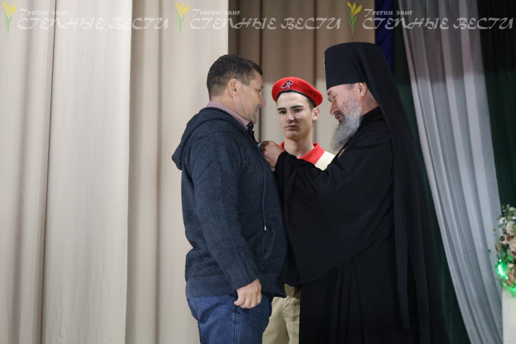 Архиепископ Юстиниан во время юбилейных торжеств вручил епархиальные медали председателю Народного Хурала Артему Михайлову и благотворителям Крестовоздвиженской церкви села Приютное: фермерам-хлеборобам Александру Воробьеву и Александру Армейскому.