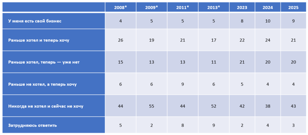 За последние 15 лет в России выросла доля предпринимателей и доверие к бизнесу со стороны общества. По опросам ВЦИОМ, проведенным в этом году, 88 % населения относятся к среднему и мелкому частному предпринимательству «очень хорошо» или «скорее хорошо» и только 6 % – «скорее плохо» и «плохо». Россияне предпринимателей уважают, ценят, но лично включаться в бизнес не хотят: как показывает статистика опросов, новых энтузиастов почти не прибавляется, а вот доля разочаровавшихся в предпринимательстве растет. На вопрос «Вы когда-нибудь хотели заниматься бизнесом, стать предпринимателем?» респонденты дали практически одинаковое количество положительных и отрицательных ответов (см. таблицу).