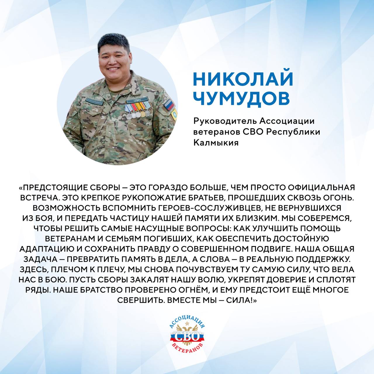 «Предстоящие сборы – это гораздо больше, чем просто официальная встреча. Это крепкое рукопожатие братьев, прошедших сквозь огонь. Возможность вспомнить героев-сослуживцев, не вернувшихся из боя, и передать частицу нашей памяти их близким. Мы соберемся, чтобы решить самые насущные вопросы: как улучшить помощь ветеранам и семьям погибших, как обеспечить достойную адаптацию и сохранить правду о совершенном подвиге. Наша общая задача – превратить память в дела, а слова – в реальную поддержку. Здесь, плечом к плечу, мы снова почувствуем ту самую силу, что вела нас в бою. Пусть сборы закалят нашу волю, укрепят доверие и сплотят ряды. Наше братство проверено огнём, и ему предстоит ещё многое свершить. Вместе мы – сила!», – отметил руководитель Ассоциации ветеранов СВО Калмыкии Николай Чумудов.