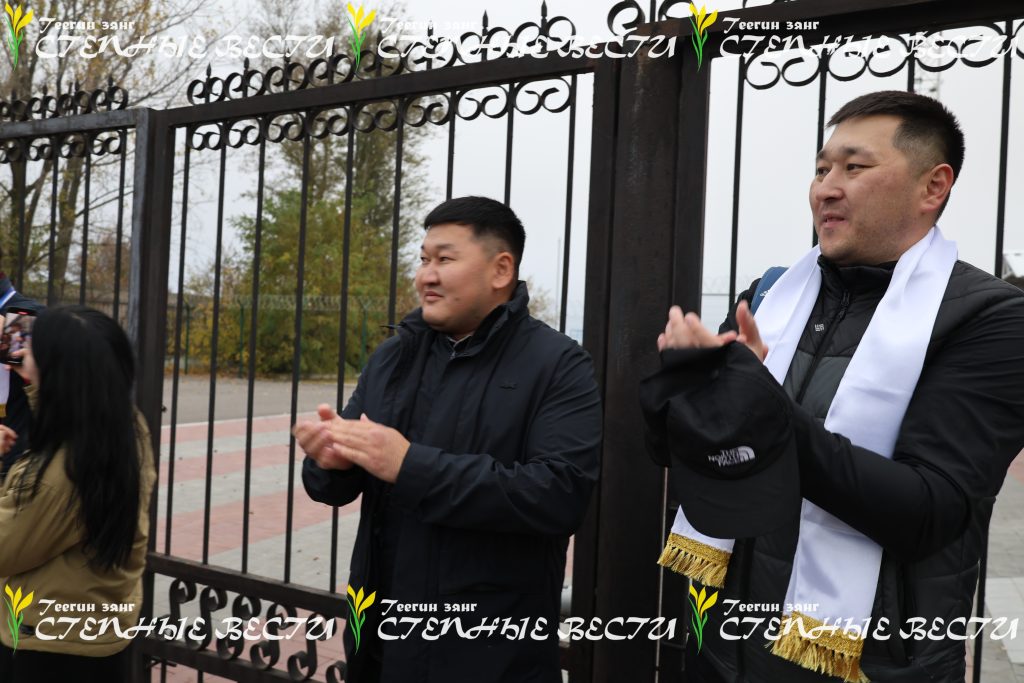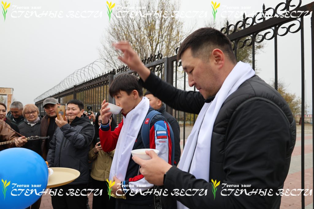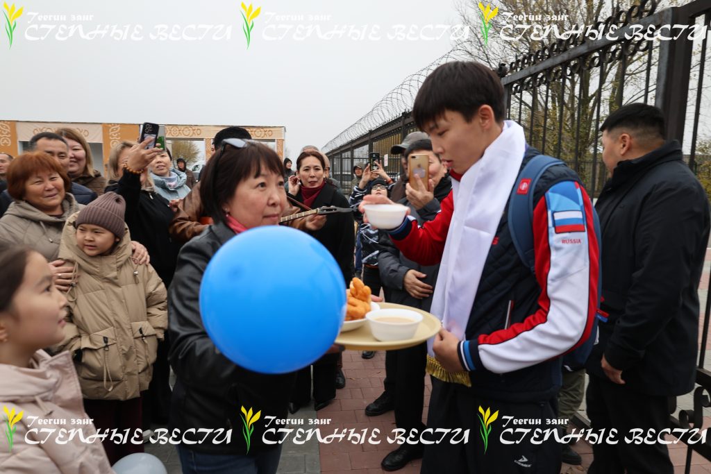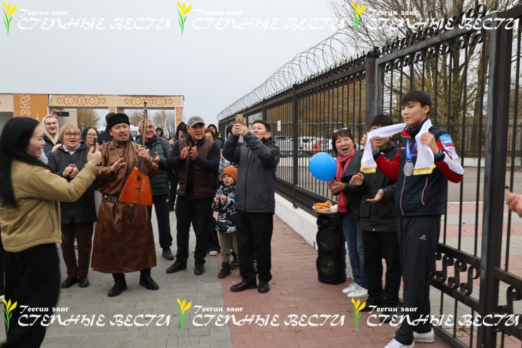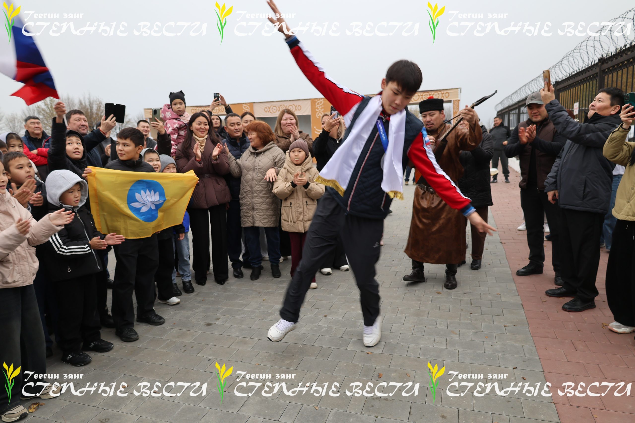 По калмыцкой традиции призера встретили джомбой, борцогами и йорялом. А Адьян под аплодисменты болельщиков, родственников, одноклубников исполнил чемпионский танец.