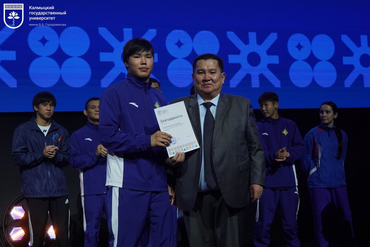 «Своим упорным трудом вы добиваетесь высоких результатов, прославляете университет, Калмыкию и Россию. Отмечая юбилей, мы отдельно чествуем вас и благодарим руководителей спортивных федераций за совместную работу. Вчера ученым советом было принято решение о премировании наших лучших спортсменов в размере 30 тысяч рублей. Но сегодня в знак благодарности каждому, кто представлял страну и побеждал, увеличиваем премии до 50 тысяч рублей. И столько же хотим вручить нашему выпускнику, чемпиону Чингизу Натырову, – сказал ректор КалмГУ Бадма Салаев. – Хочу поздравить всех с юбилеем Калмыцкого государственного университета. 55 лет – две прекрасные пятерки – это важное событие для республики, потому что университет взрастил тысячи и тысячи дипломированных специалистов. Он был и остается опорой, надеждой и верой для жителей Калмыкии, став за эти годы уже международным центром образования, культуры, науки и спорта. У нас учатся не только наши земляки, но и представители 35 регионов России и 43 стран ближнего и дальнего зарубежья».