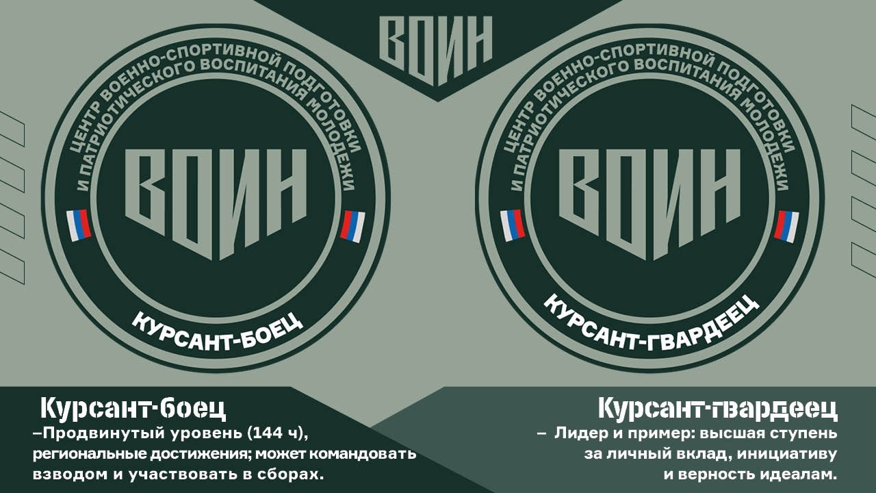 Всего их четыре для воспитанников 14-17 лет. Первую из них будут получать новобранцы, далее идут курсант, боец и гвардеец. Ступень присваивается за учебные часы, активность и победы. Также будут обновляться шевроны на рукаве и права (например, стать командиром взвода или помощником инструктора).