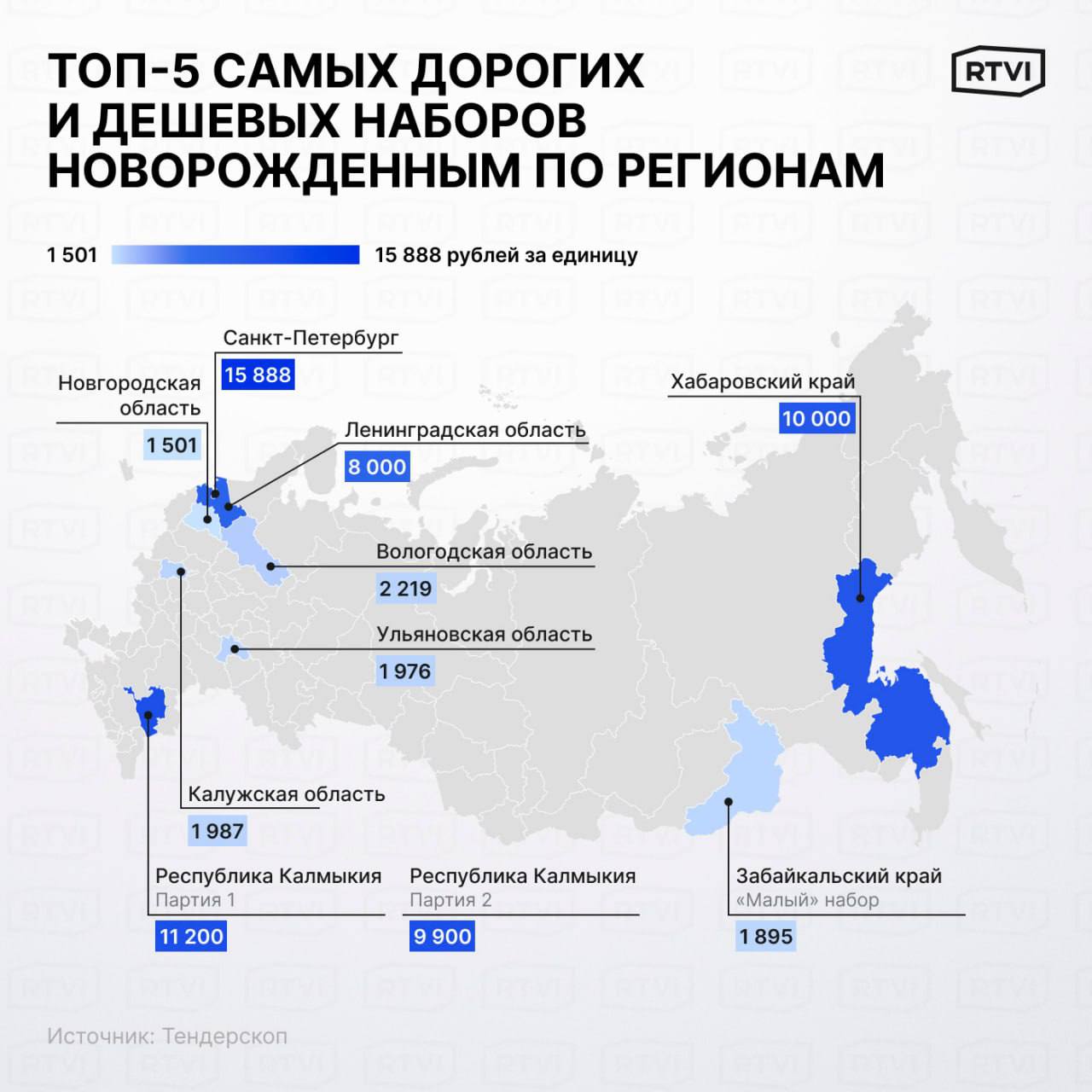 С 2018 года в 38 регионах России реализуется программа поддержки молодых родителей, где при рождении ребенка вручаются специальные подарки. Состав и стоимость этих наборов определяются на уровне каждого региона, что приводит к различиям. Цены варьируются от простых комплектов стоимостью около 1500 рублей до более дорогих, которые могут достигать 16 тысяч рублей.