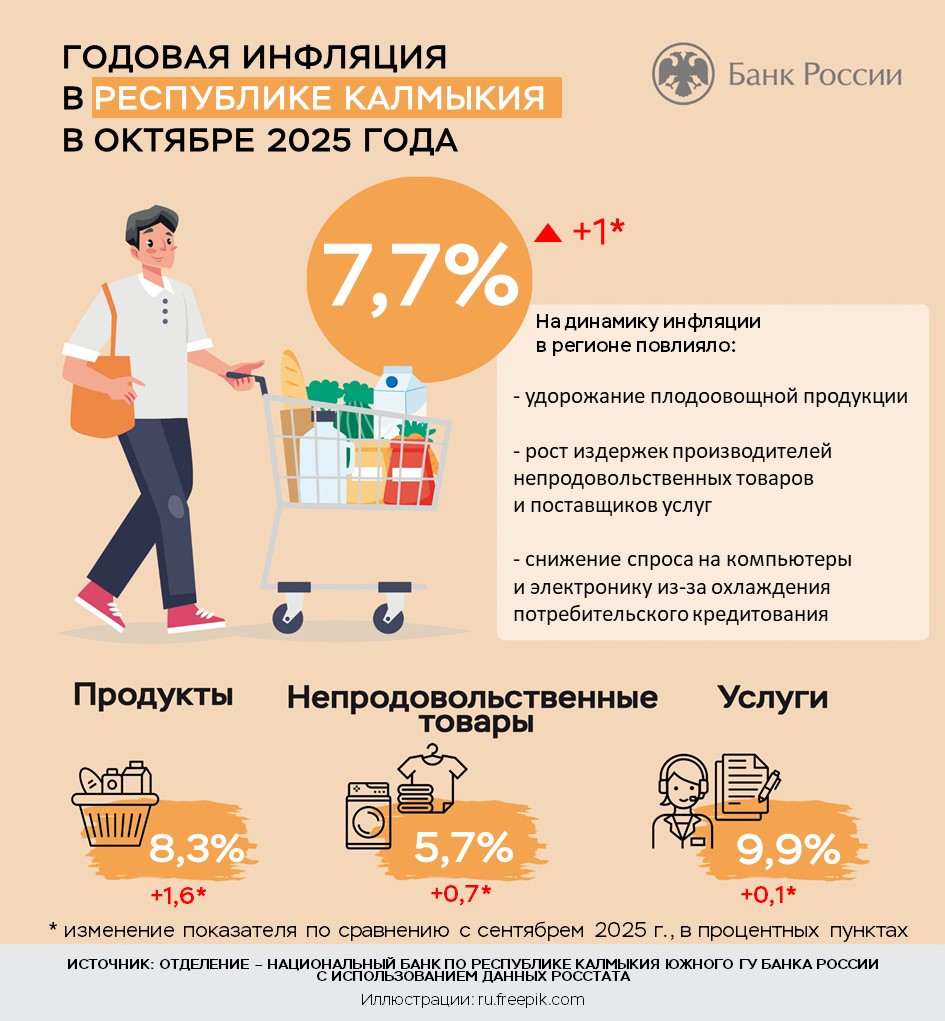 В Калмыкии годовая инфляция в октябре увеличилась до 7,7 %. Это почти совпадает с уровнем по стране в целом, но ниже, чем в Южном федеральном округе (8,1 %).