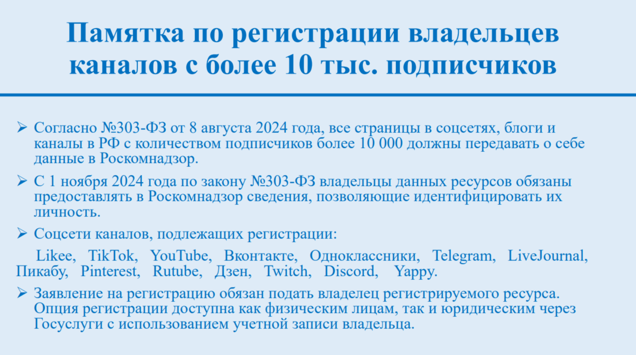 В соответствии с федеральным законом все блоги, страницы в соцсетях и каналы, чья аудитория превышает 10 тысяч подписчиков, подлежат обязательной регистрации. Владельцы таких ресурсов обязаны предоставить в Роскомнадзор персональные данные для идентификации.