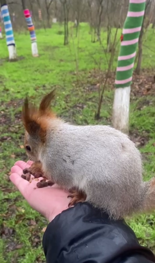 Наступили морозы. Настоящие первые зимние дни для белок, которые с сентября проживают в парке «Дружба».