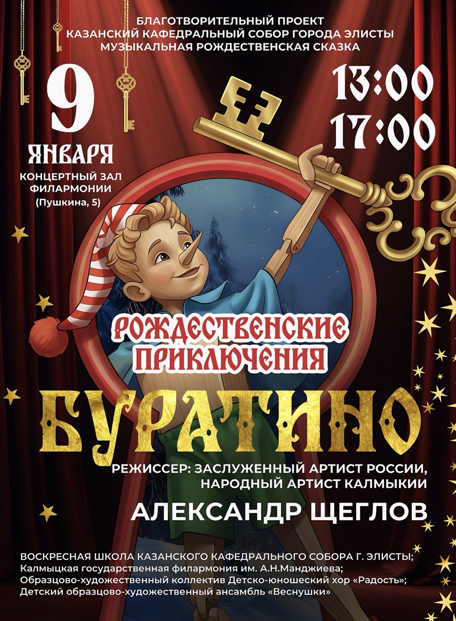 Завтра в зале Государственной филармонии им. А.Н. Манджиева состоится грандиозное представление «Рождественские приключения Буратино». В проекте воскресной школы Казанского кафедрального собора принимают участие актеры, педагоги, прихожане, коллектив филармонии, образцово-художественные детские коллективы – хор «Радость» и ансамбль «Веснушки».