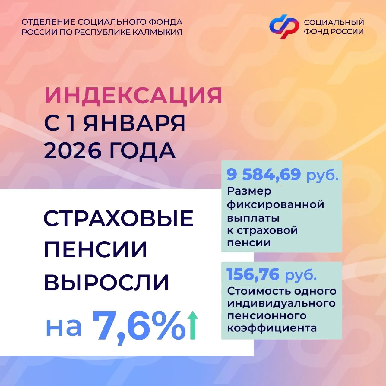 С 1 января в Калмыкии провели индексацию страховых пенсий на 7,6%. Это касается пенсий по старости, инвалидности и по случаю потери кормильца.