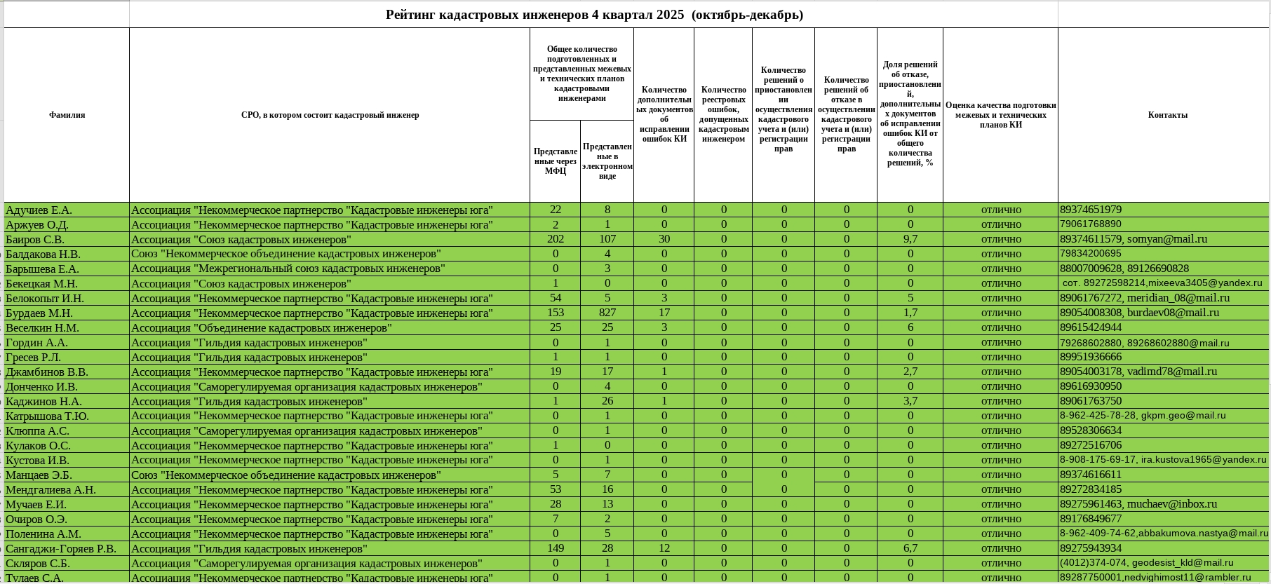 Росреестр Калмыкии подготовил очередной независимый рейтинг. В нем представлены специалисты, оказывающие услуги по межеванию земельных участков, подготовке технических планов и паспортов, а также других документов, необходимых для постановки недвижимости на кадастровый учет. Рейтинг разбит на три зоны, в зеленую попали 27 инженеров из 49. Их деятельность оценивается на «отлично»: доля приостановлений и отказов – менее 10 %.