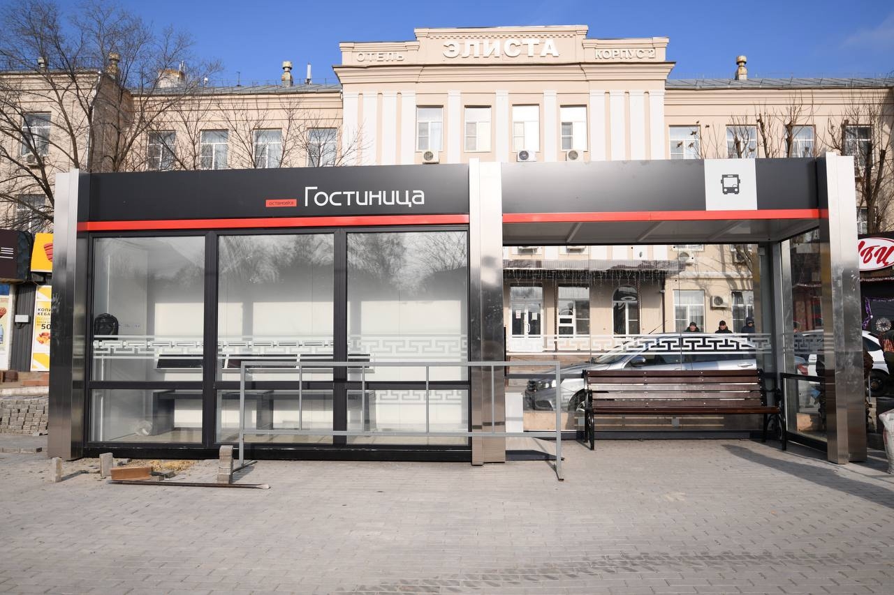В Элисте на автобусной остановке «Гостиница» установили остановочный павильон. Это временно решение – все дело в задержке поставок необходимого материала и оборудования для строительства полноценного павильона.