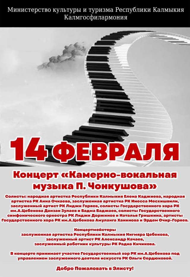 14 февраля в Элисте прозвучат произведения выдающегося калмыцкого композитора Петра Чонкушова. В Калмыцкой государственной филармонии им. А.Н. Манджиева представят программу, посвященную 95-летию со дня рождения первого профессионального композитора Калмыкии.