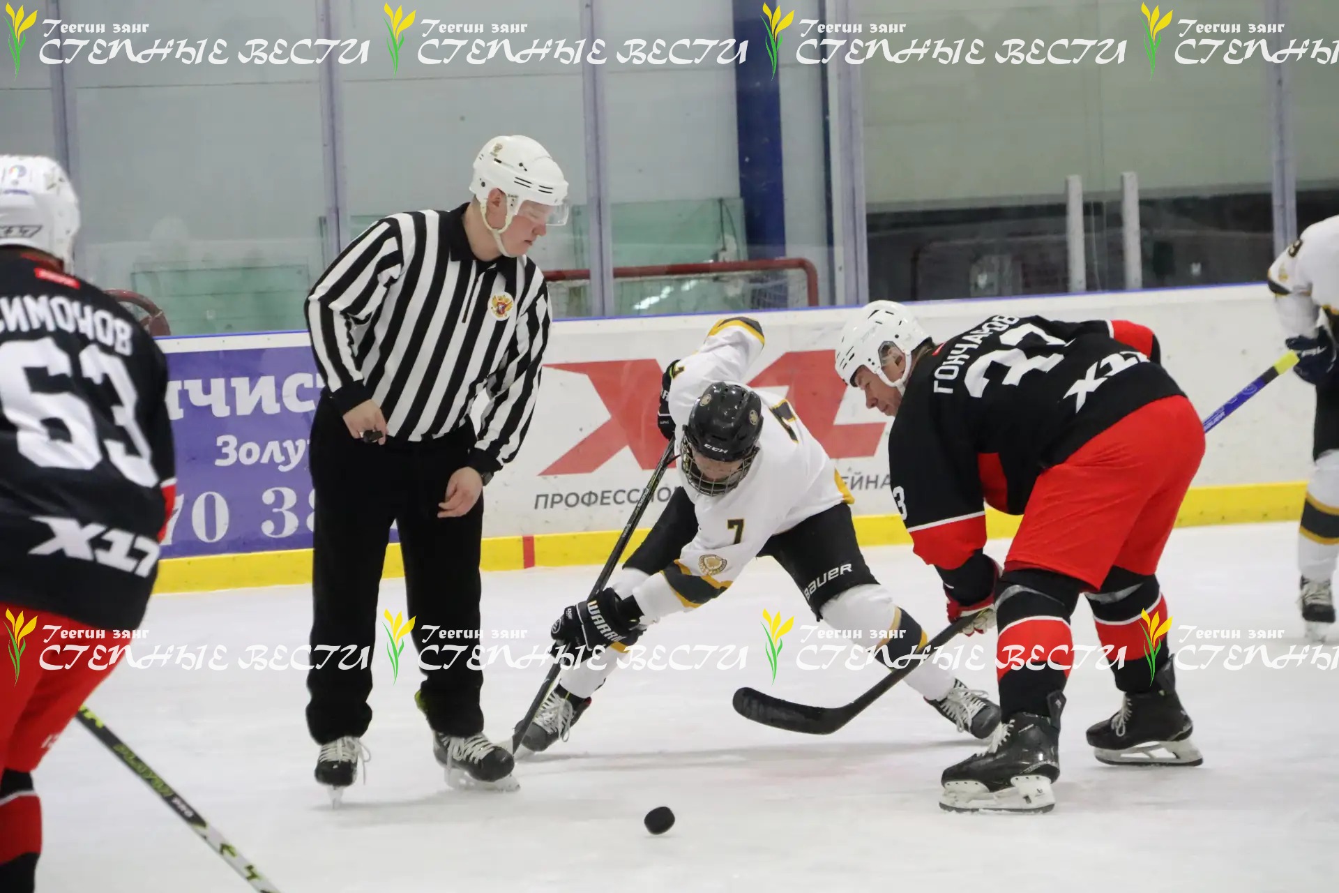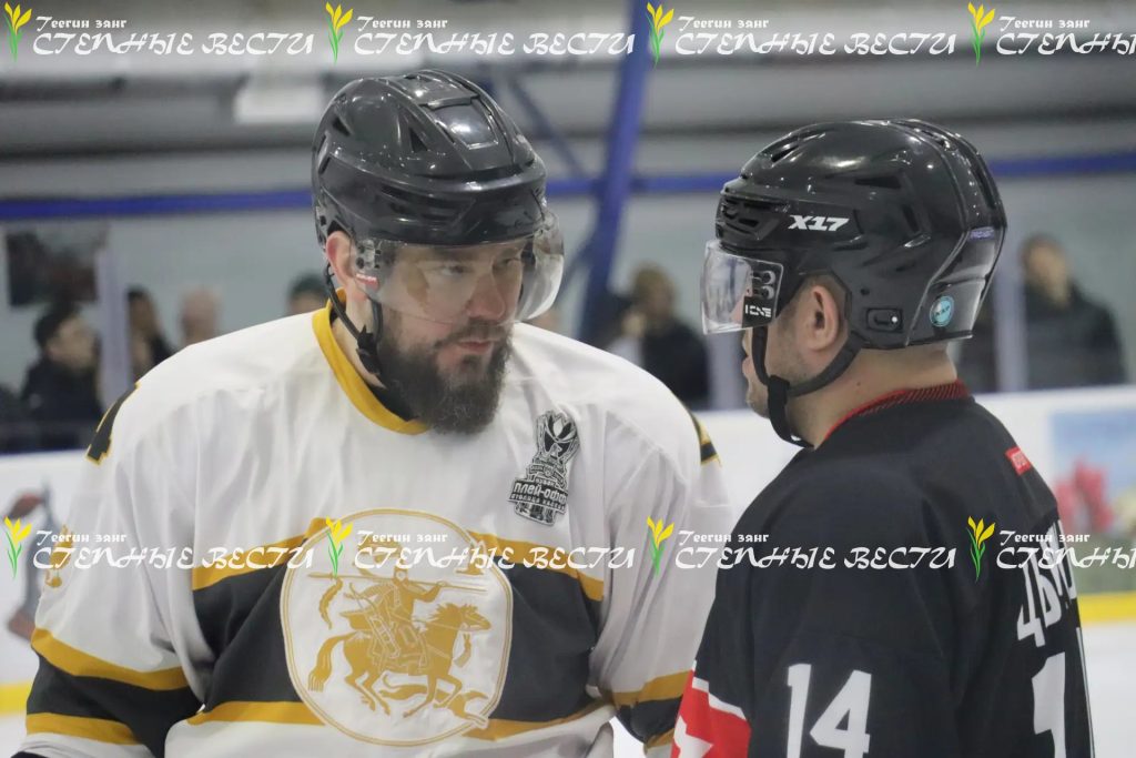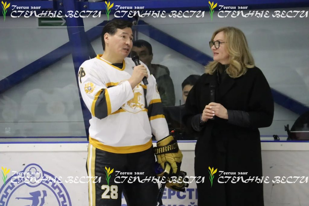 Перед началом игры участников спортивного события приветствовали и напутствовали Глава Калмыкии Бату Хасиков, который вышел на лед под номером 28, и Бегонита Харламова, прибывшая в Элисту вместе со своей командой.