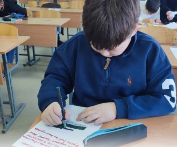 «Привет солдат, меня зовут Эмиль. Я учусь в 4 классе. Мы всей страной в тебя верим. Береги себя, ты нам нужен!», — нетвердым детским почерком выведено на листе бумаги.