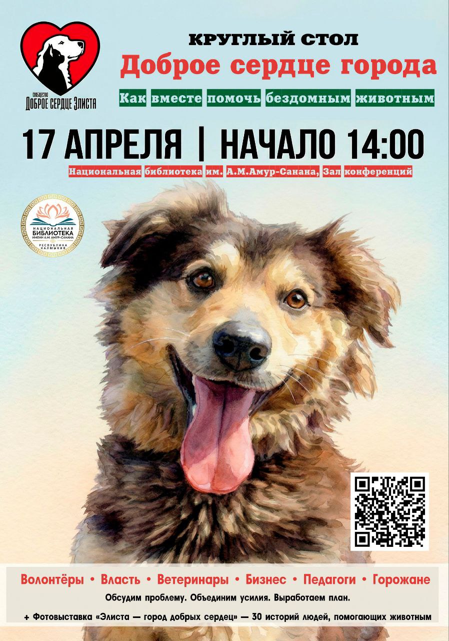 Речь пойдет о программах стерилизации, вакцинации и пристройств бездомных кошек и собак, а также просветительской работе с детьми и молодежью. Круглый стол состоится 17 апреля в Национальной библиотеке им. А. М. Амур-Санана. В фойе библиотеки представят фотовыставку «Элиста – город добрых сердец»: портреты людей, меняющих жизнь бездомных животных к лучшему.