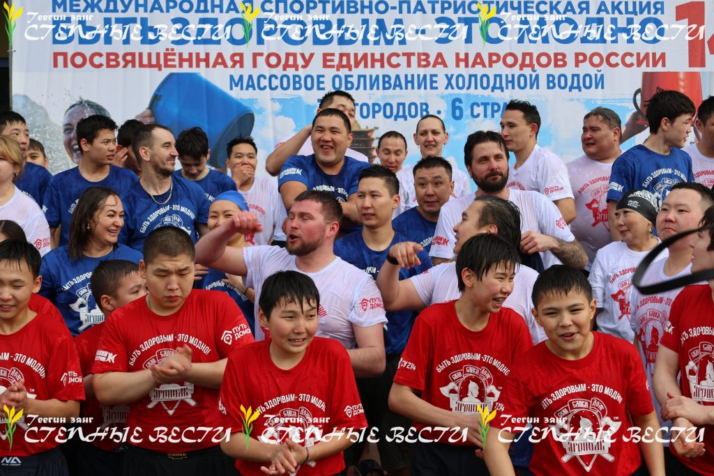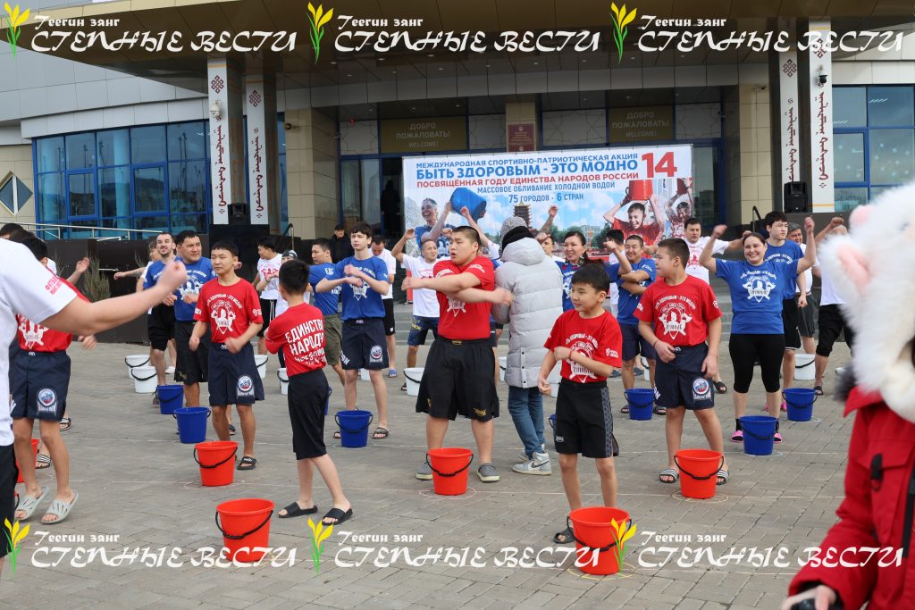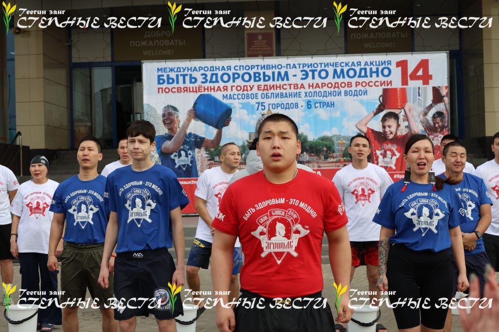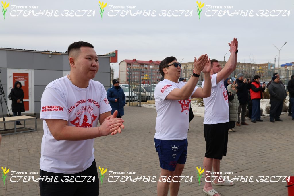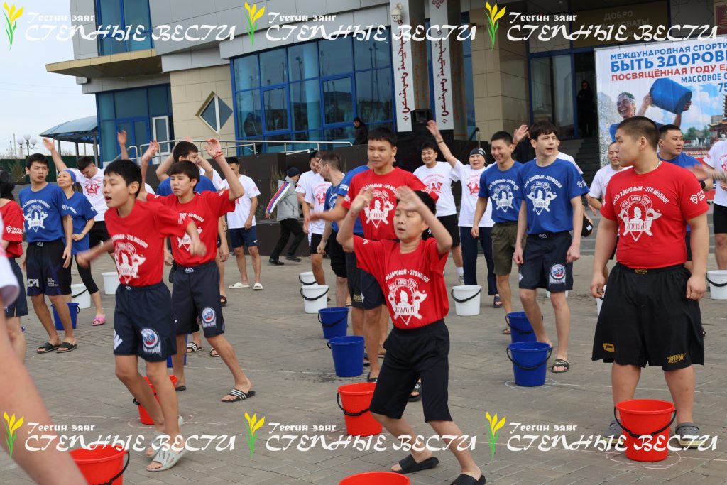 Под песню Дениса Майданова «Флаг моего государства» участники вышли на обливание в футболках с символикой акции в цветах российского триколора. В таких же оттенках были и подготовленные ведра с холодной водой. После небольшой разминки на всех площадках телемоста состоялось одновременное массовое обливание. В Элисте самой многочисленной группой среди участников, пожалуй, стали представители военного спортивно-патриотического клуба «Гром 08». «Нас тут чуть больше 30 человек – это наши воспитанники разного возраста. Самому младшему – шесть лет, тоже решил попробовать, но вместе с ним принимают участие и его родители. Мы провели разминку, подготовили организм к такой нагрузке. Это акция патриотической направленности, и мы не могли не прийти. Также это прививание нашим детям закалки, силы духа», – отметил наставник юных спортсменов Бембя Боджаев.