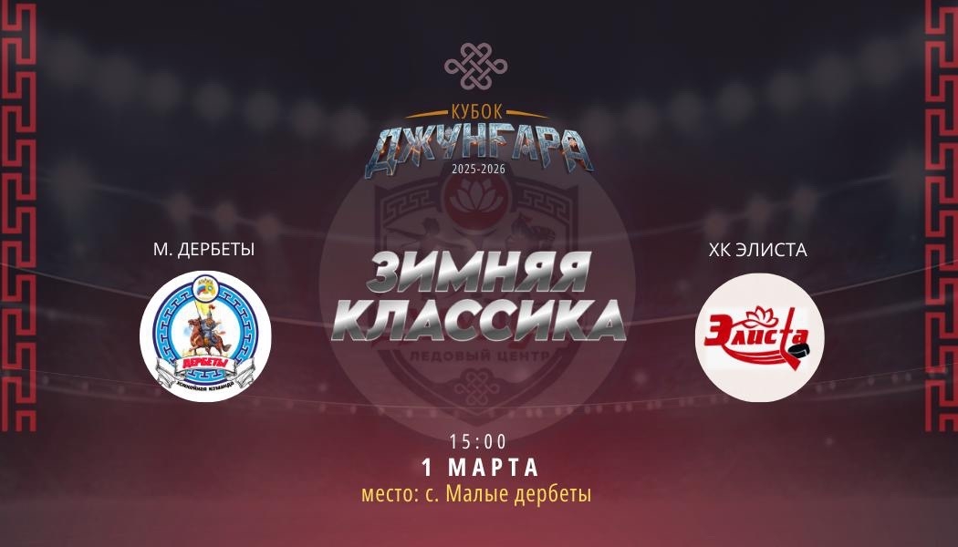 «Малые Дербеты» и «Элиста». Матч состоится в 15 часов в селе Малые Дербеты, на родине одноименной команды. Хоккеисты сыграют на новом всепогодном катке, который впервые примет официальный матч.