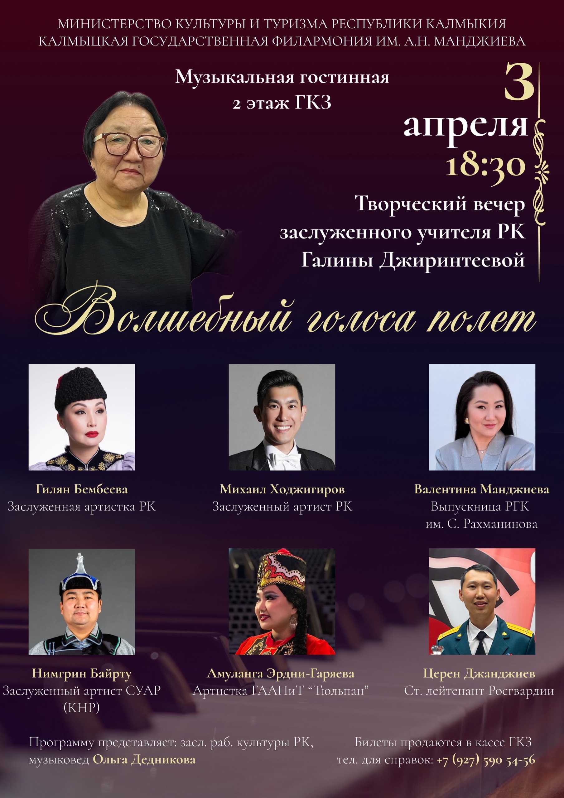 Он пройдет 3 апреля в Калмгосфилармонии им. А. Н. Манджиева. В музыкальной гостиной представят программу «Волшебный голоса полет». Более 50 лет Галина Джиринтеева проработала в Колледже искусств им. П. О. Чонкушова. За эти полвека она воспитала целую плеяду талантливых артистов.