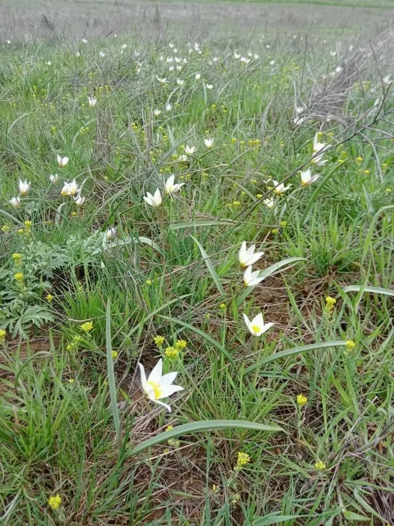 Основная волна цветения знаменитого тюльпана душистого (Геснера) ещё впереди, но первые ласточки уже здесь — зацвели поля тюльпанов двуцветковых.