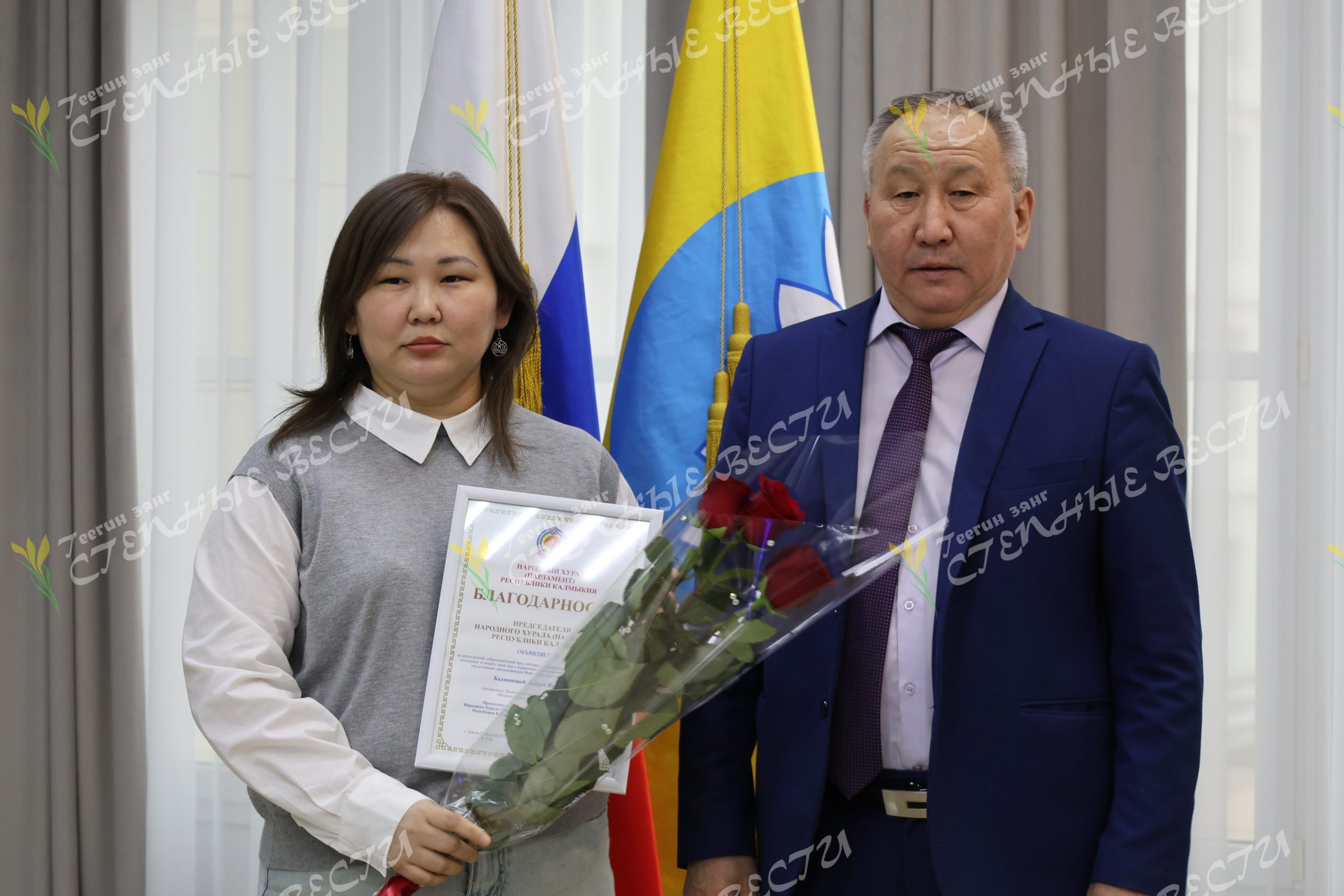 Кроме того, первое заседание совет начал с приятных событий. За многолетний добросовестный труд почетную грамоту правительства РК получили председатель Калмыцкого реготделения Всероссийского общества инвалидов Валерий Решетников и его заместитель Елена Городничая. Ряд сотрудников отделения получил благодарности председателя Народного Хурала.