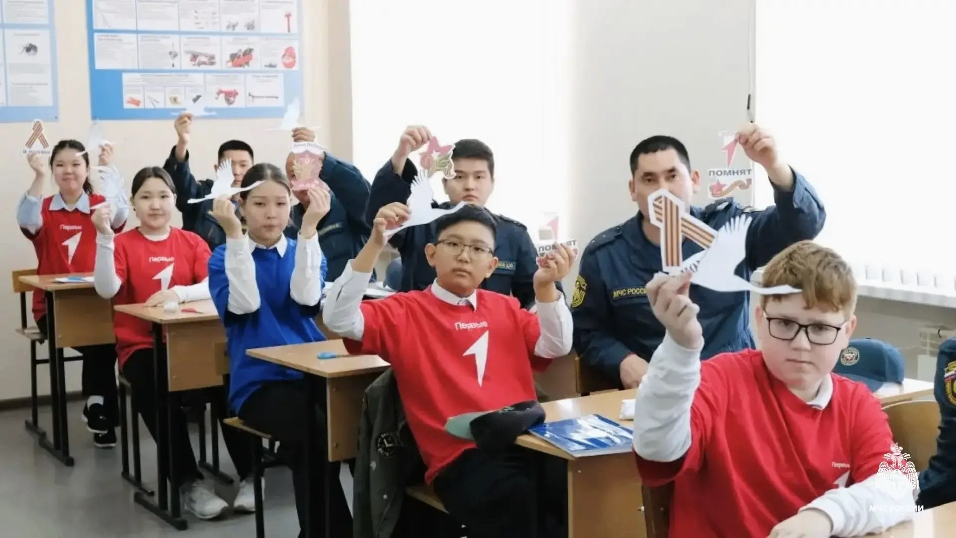 В гости к огнеборцам 18-й специализированной пожарно-спасательной части пришли учащиеся шестых классов элистинской средней школы №17 им. Д.Н. Кугультинова. Вместе с пожарными дети оформляли окна тематическими вырезанными символами Победы. Изображения цветов, георгиевских лент, вечного огня, голубей мира, журавлей и многих других символов, связанных с Великой Победой появились на фасадах и окнах части.