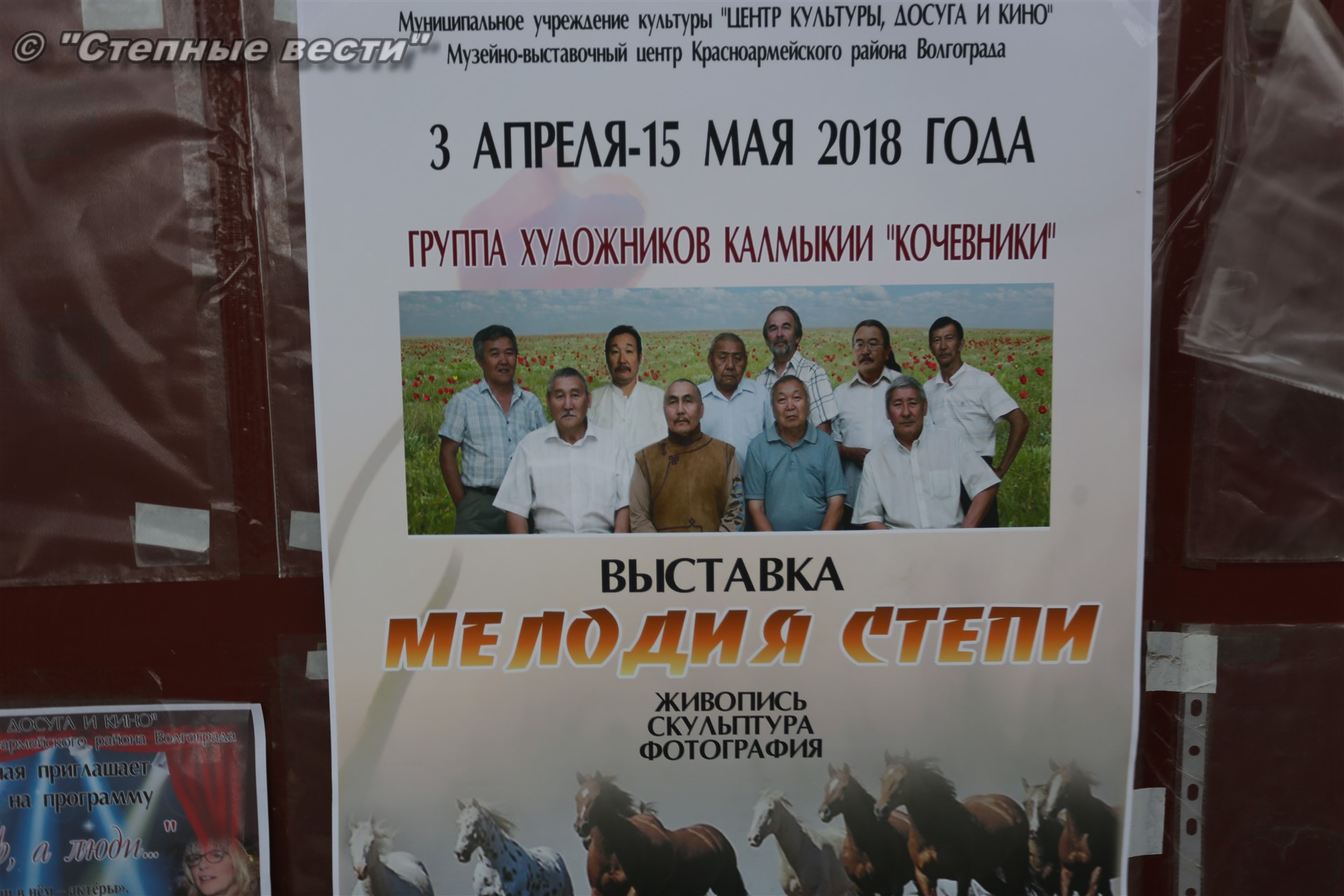 В Волгограде, в музейно-выставочном центре Красноармейского района муниципального учреждения культуры «Центр культуры, досуга и кино», с первых чисел апреля работает выставка живописи, скульптуры и фотографии «Мелодия степи», на которой представлены работы лучших мастеров изобразительного искусства Калмыкии, объединенных в группу «Кочевники».