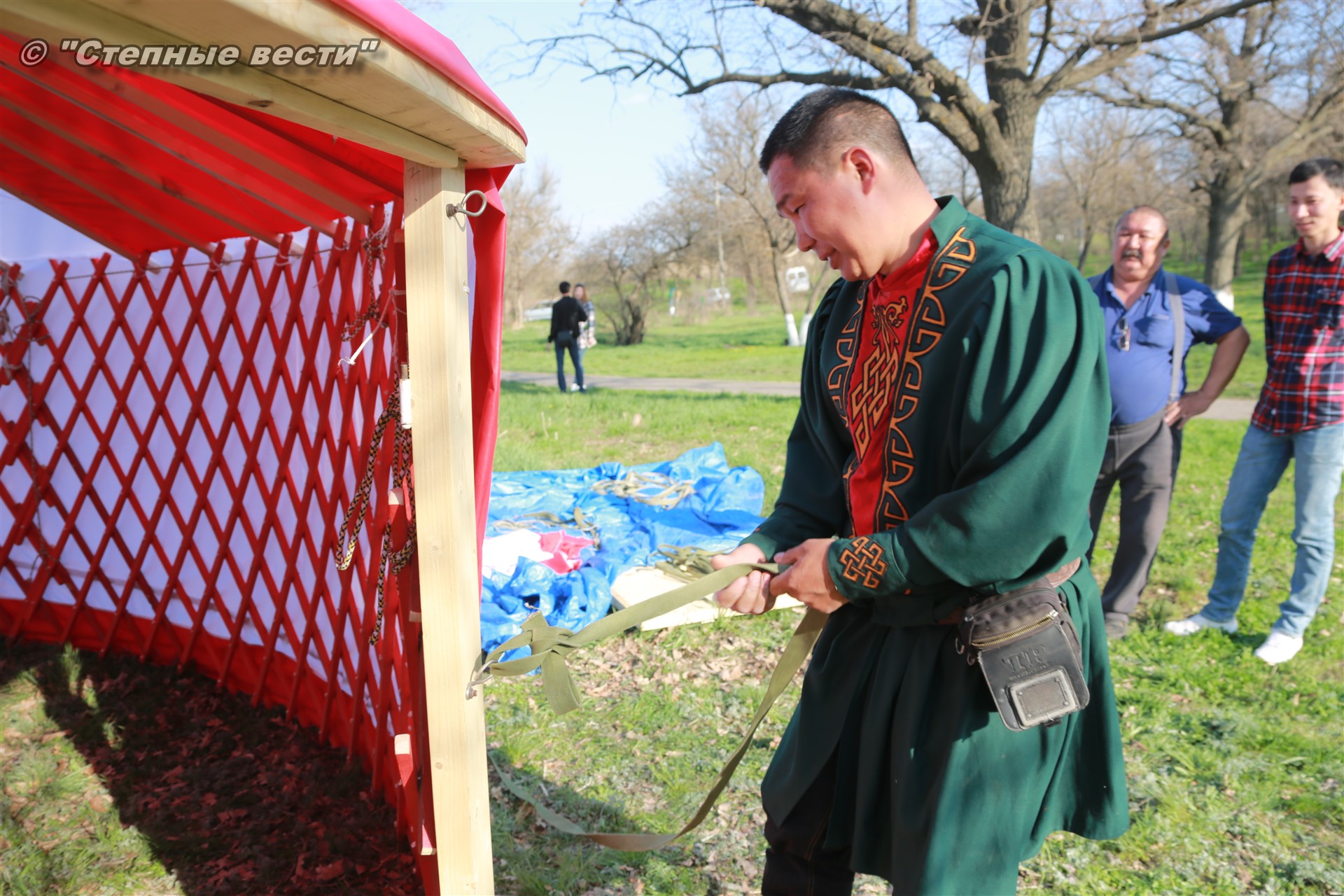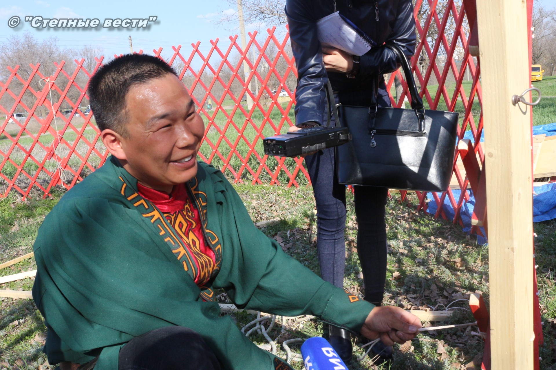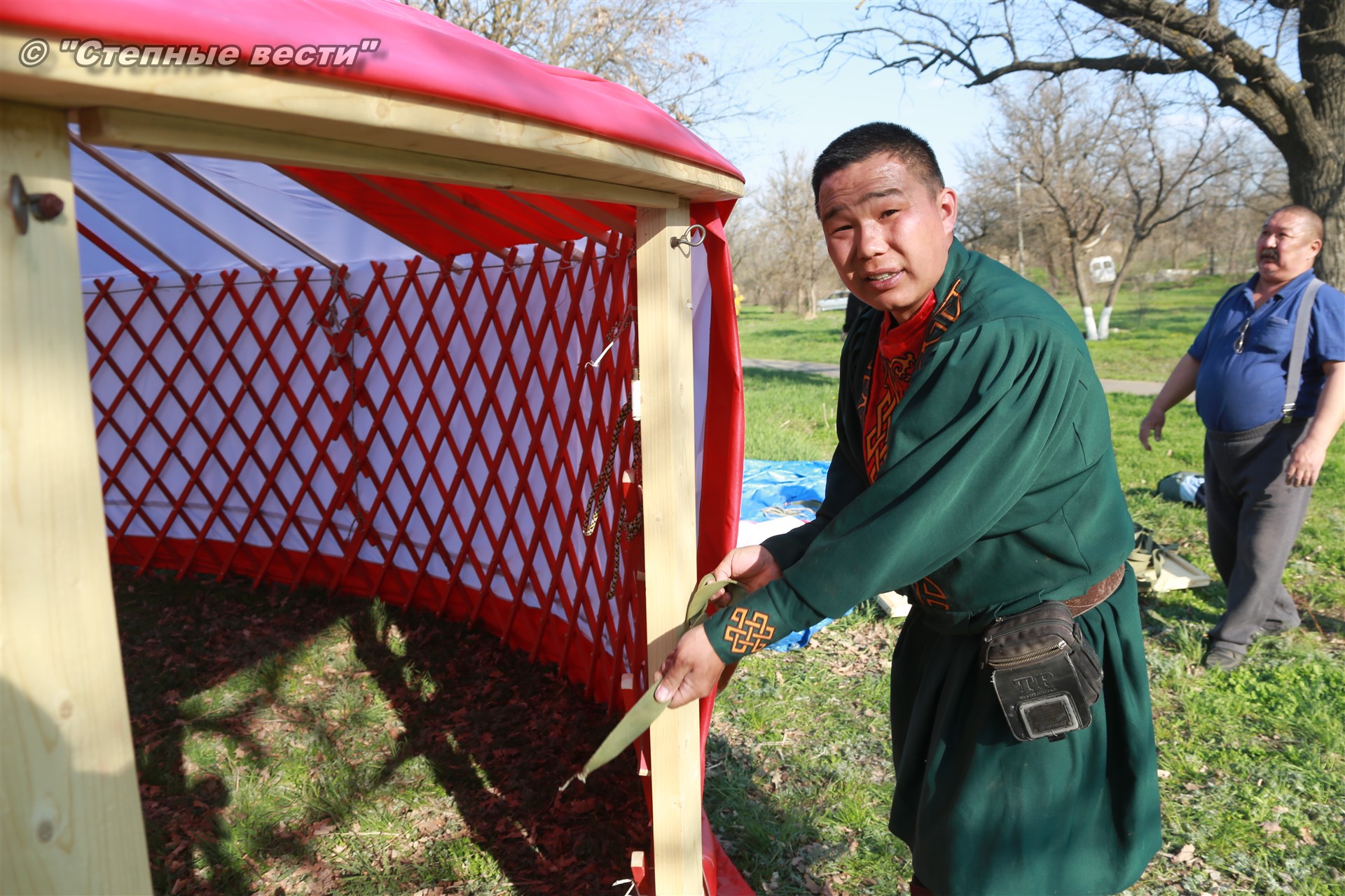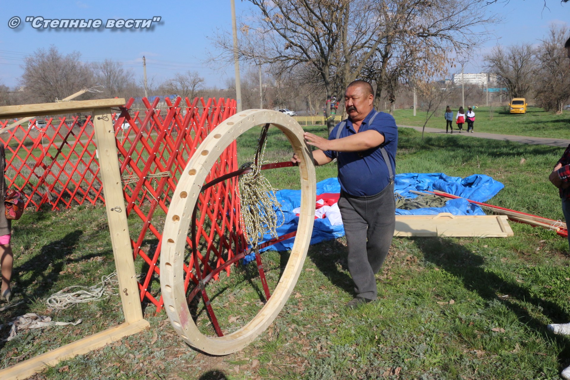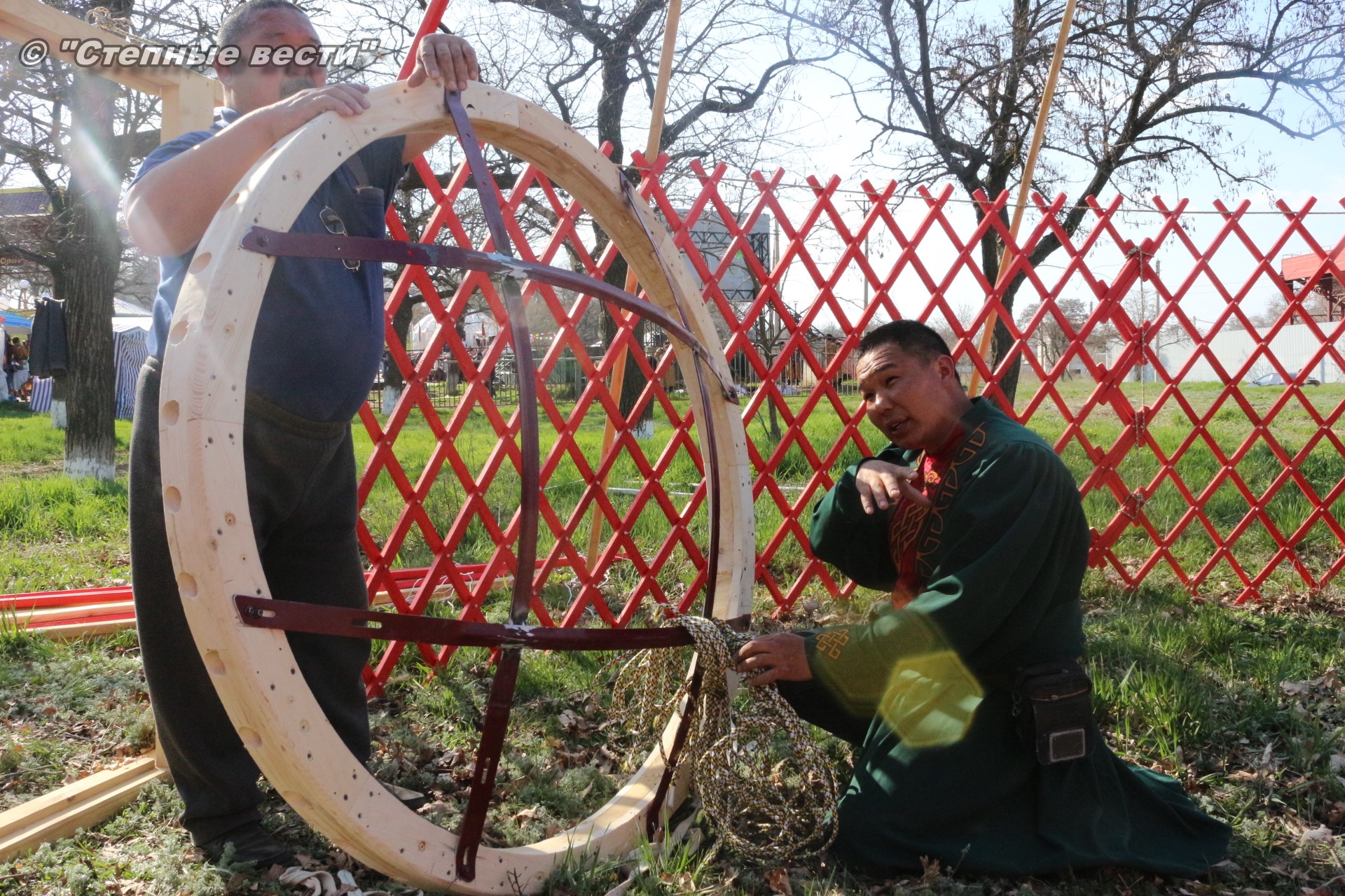 Находясь под впечатлением от увиденного, я продолжил свою экскурсию по хотону, тем более что встретившаяся моя коллега сказала, что неподалеку от этнохотона происходит процесс сборки-разборки юрты. Поблагодарив Ирину Алексеевну, я поспешил туда. Ведь не каждый день можно видеть как собирают юрту. Журналистская братия, окружив ремесленников, принялась расспрашивать их. На наши вопросы любезно ответил руководитель мастерской «Ишкя Гер» Эрдни Очир-Араев.