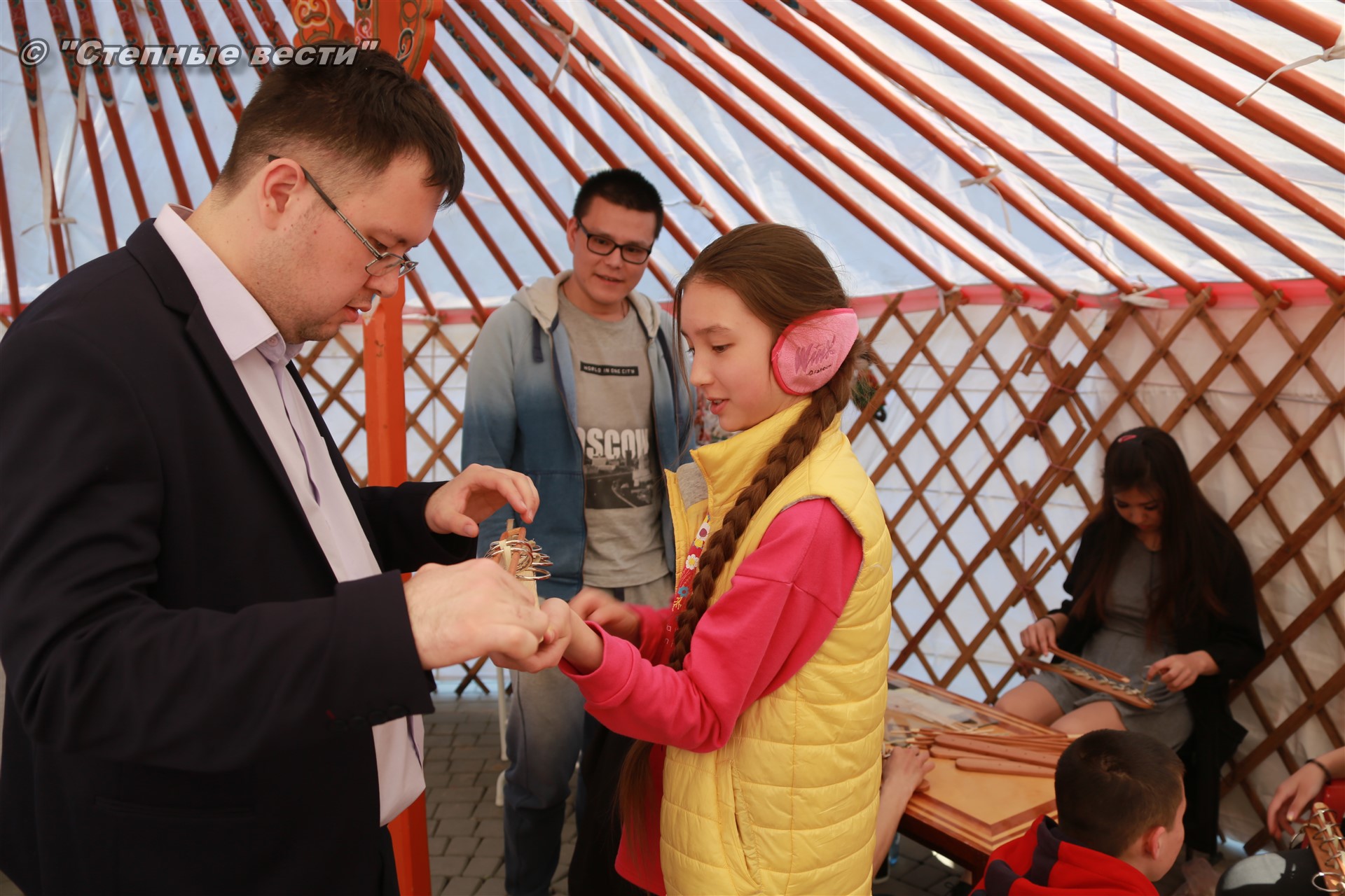 Пожелав ребятам удачи, я решил пройтись по кибиткам, где расположись наши народные умельцы. И в одной из них я задержался подольше, поскольку там проводился мастер-класс по известной национальной игре-головоломке «Нярн шинҗ». Мое внимание особо привлекла маленькая девочка, которая, как опытный игрок, поэтапно объясняла мужчине, как вынуть планку («смычок») из плена колец. В течение нескольких минут я с таким интересом наблюдал за тем, чем же все закончится. И вот спустя некоторое время вуаля – планка освобождена.