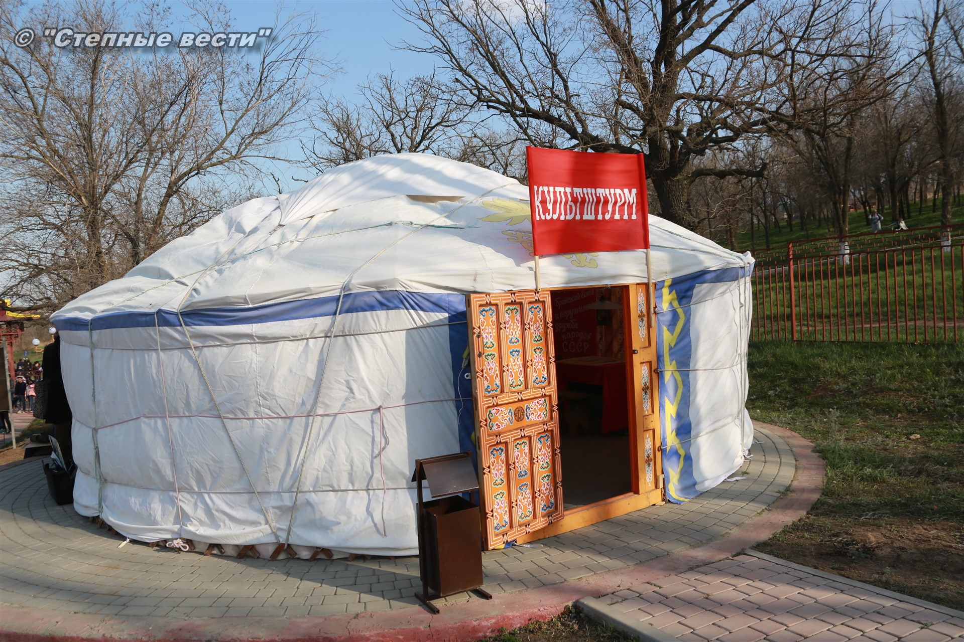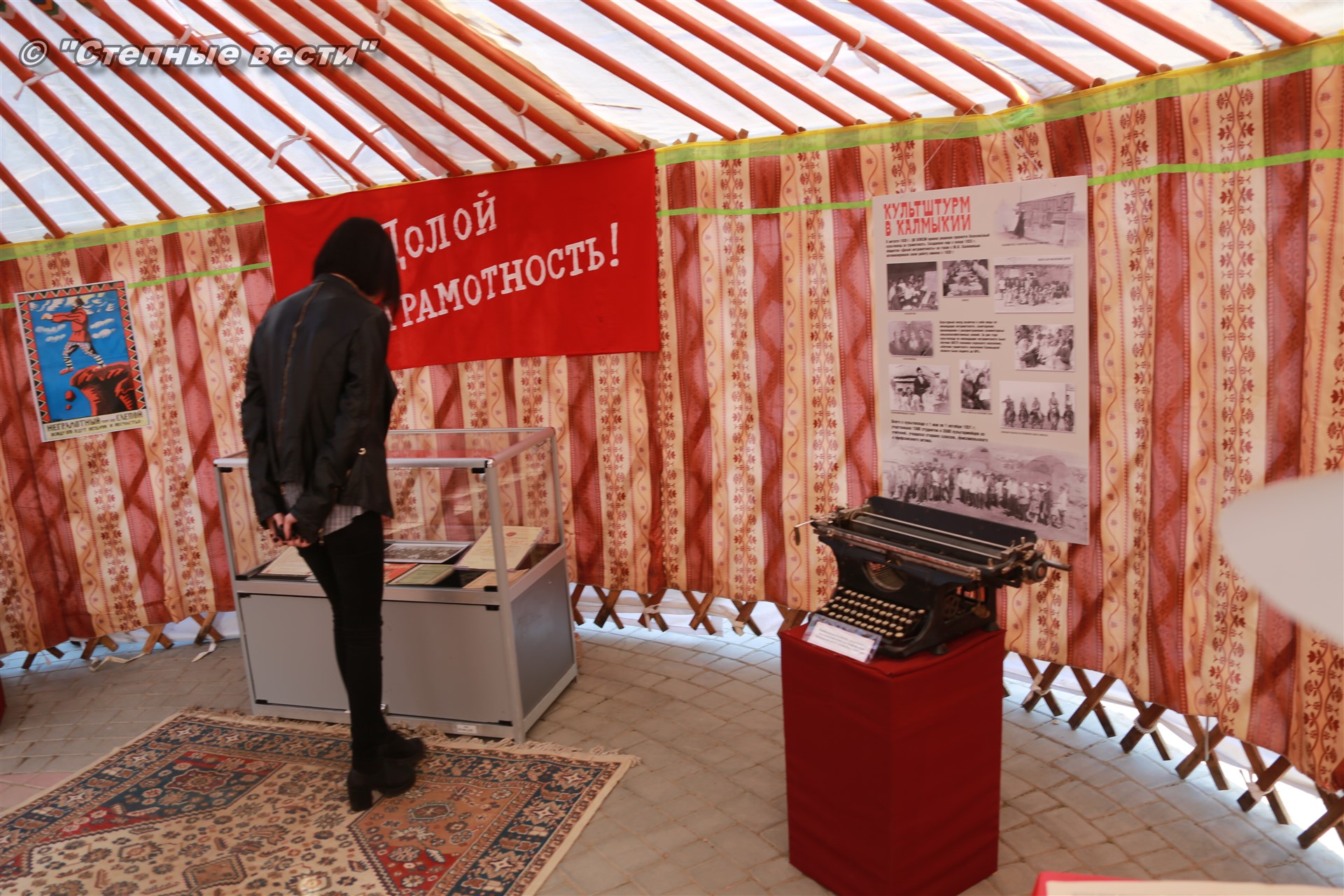 В этнохотоне, на первый взгляд, кажется, что все как-то обыденно и ничего нового. Но стоило поближе приглянуться, то можно было встретить много чего интересного. Мое внимание привлекла табличка возле одной из кибиток с названием «Культштурм в Калмыкии». Зайдя туда, я встретил научного сотрудника экспозиционного отдела Национального музея Калмыкии им. Н. Пальмова Ирину Каруеву и поинтересовался экспозицией, которая располагалась в кибитке.