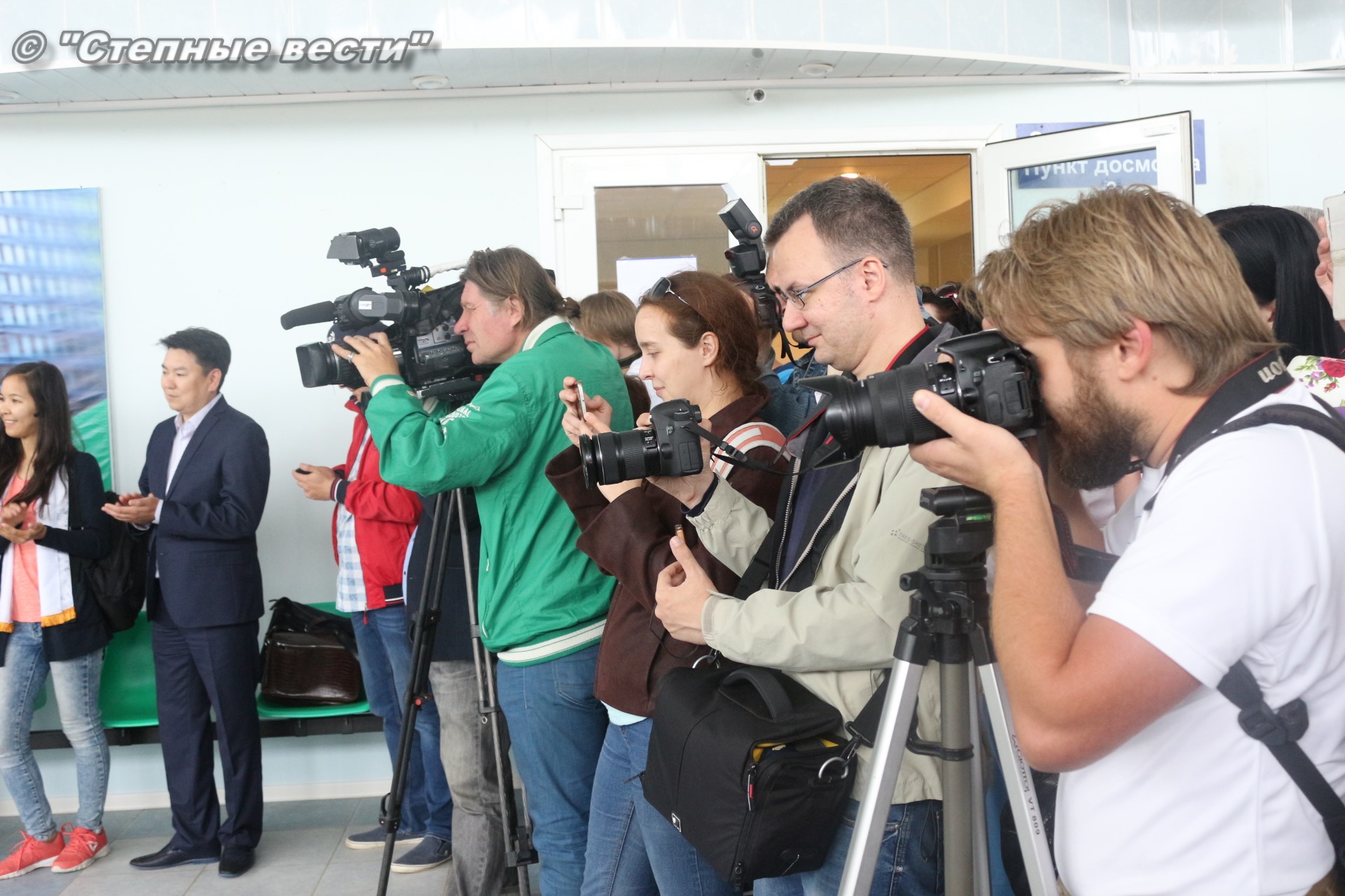 По уже калмыцкому обычаю их встретили с хадаками, джомбой и борцогами. А затем в холле аэропорта состоялось торжественное мероприятие, приуроченное встрече первого рейса из Ростова-на-Дону.