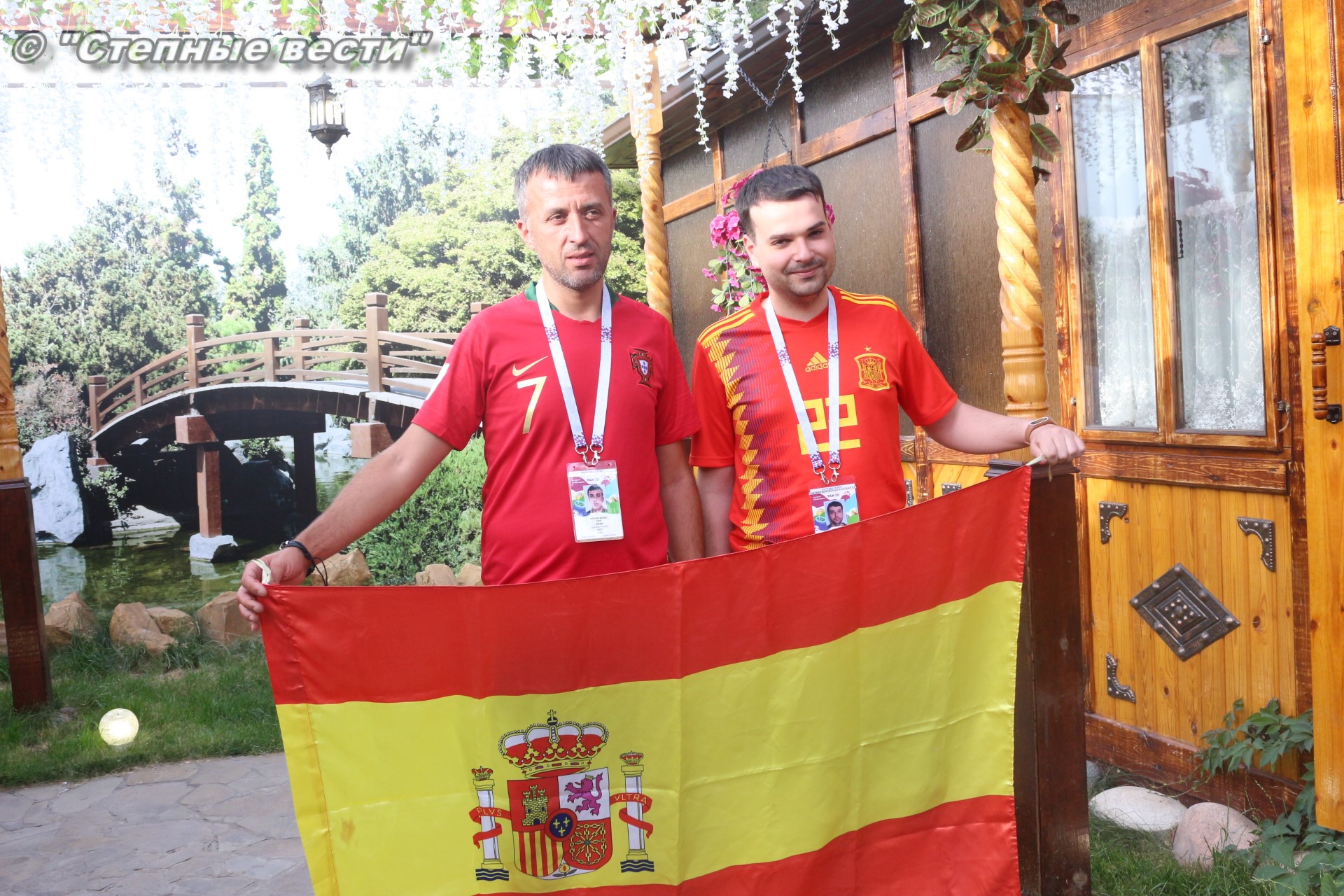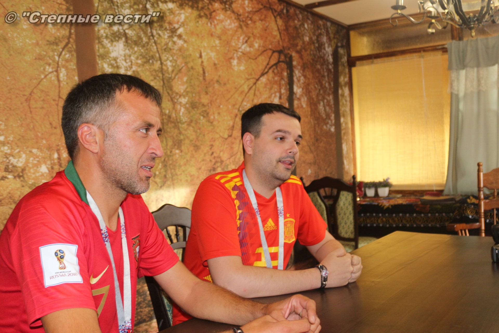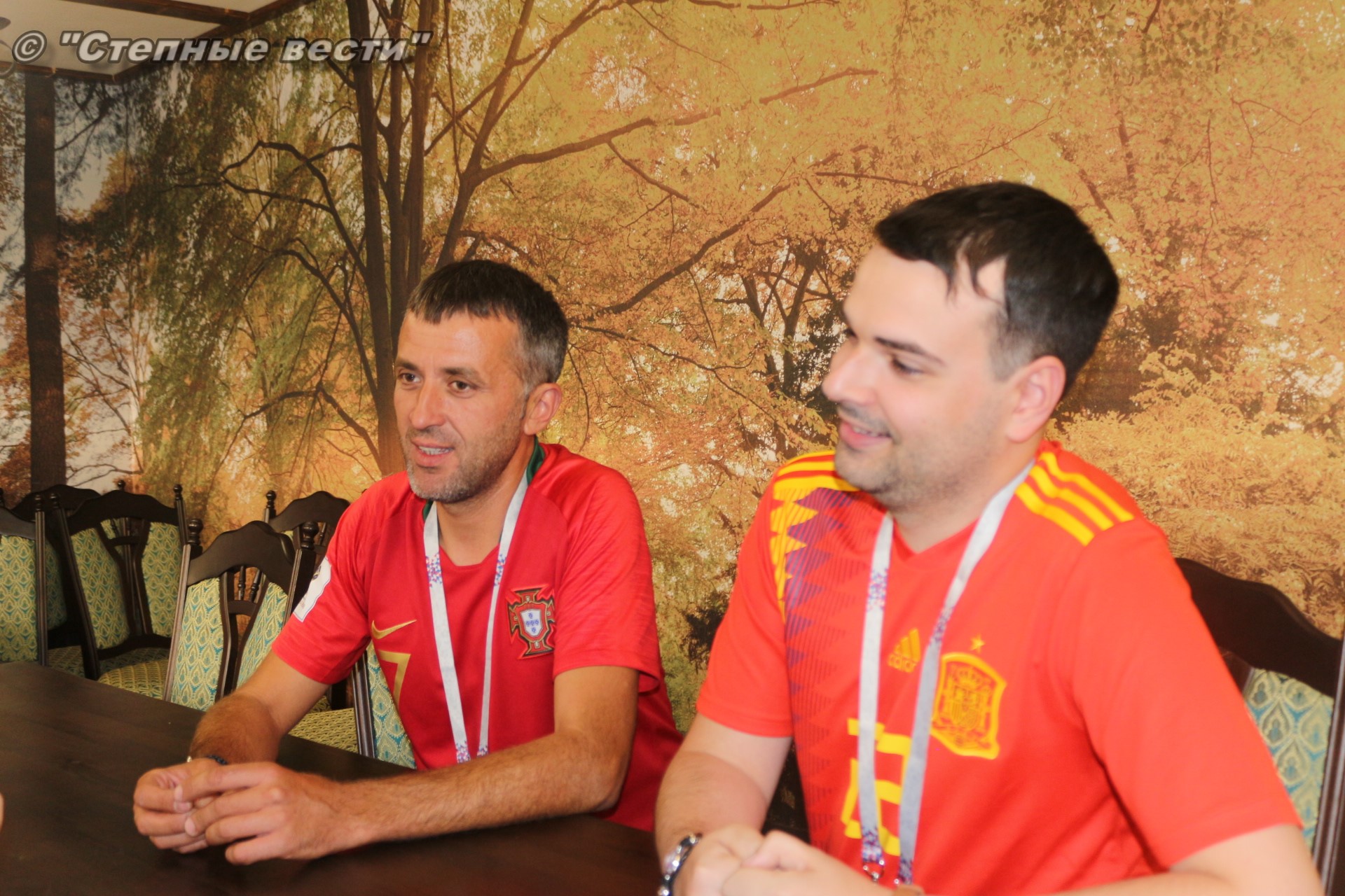 Ну а сегодня будет проведен полноценный игровой день, в котором будет сыграно 3 матча. И, конечно же, столбом стоит игра между грандами европейского и мирового футбола сборными Испании и Португалии, которая пройдет в Сочи. В преддверии этой игры мне посчастливилось в Элисте встретить болельщиков этих команд Паулу Жоржи Карвальо Машаду и Педро Фернандес Кастильо. Особая благодарность за организованную встречу с ними фотографу Виталию Катышкину. В Россию молодые люди приехали, как выяснилось во время беседы, потому что они являются калмыцкими зятьями.