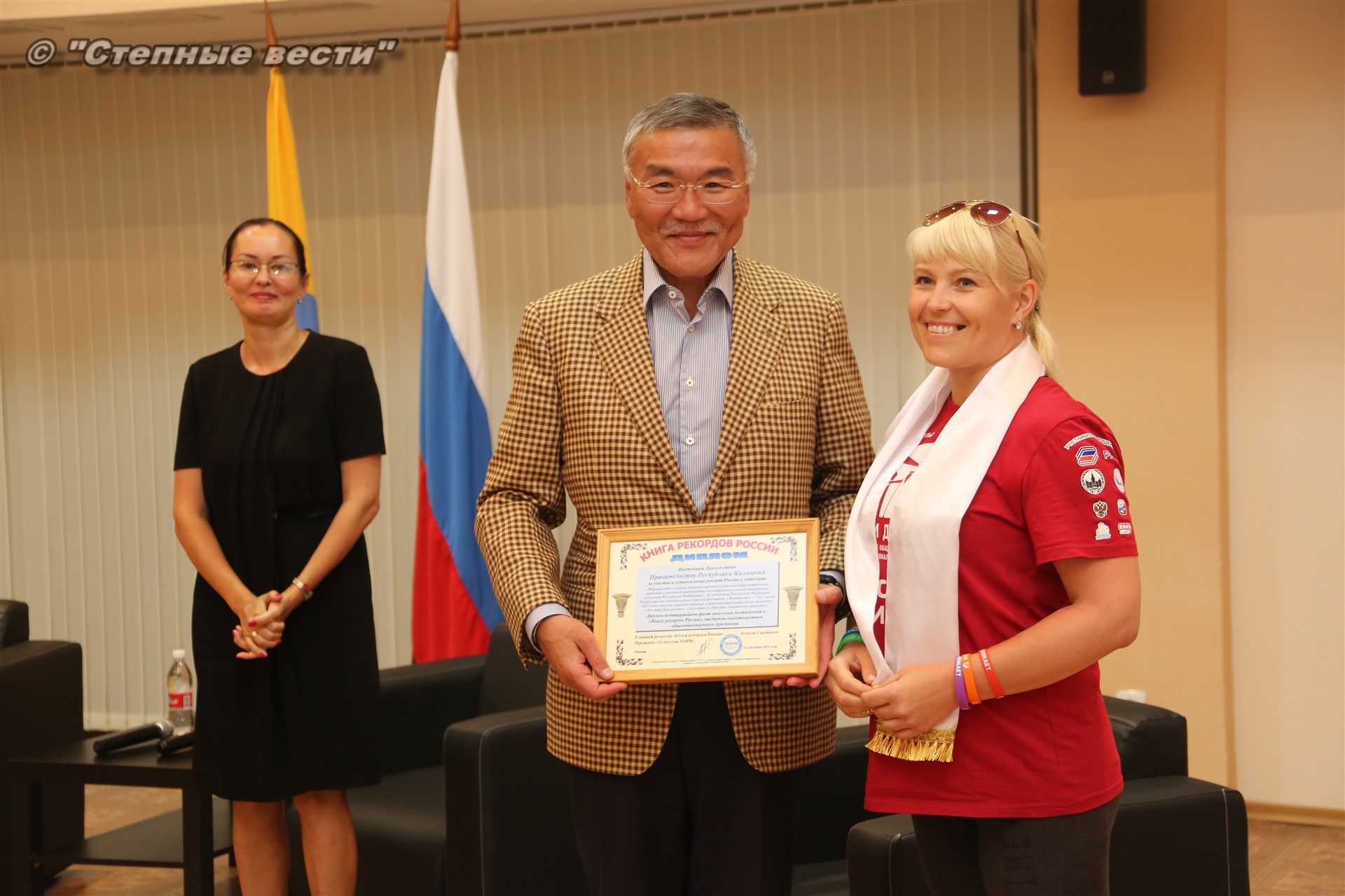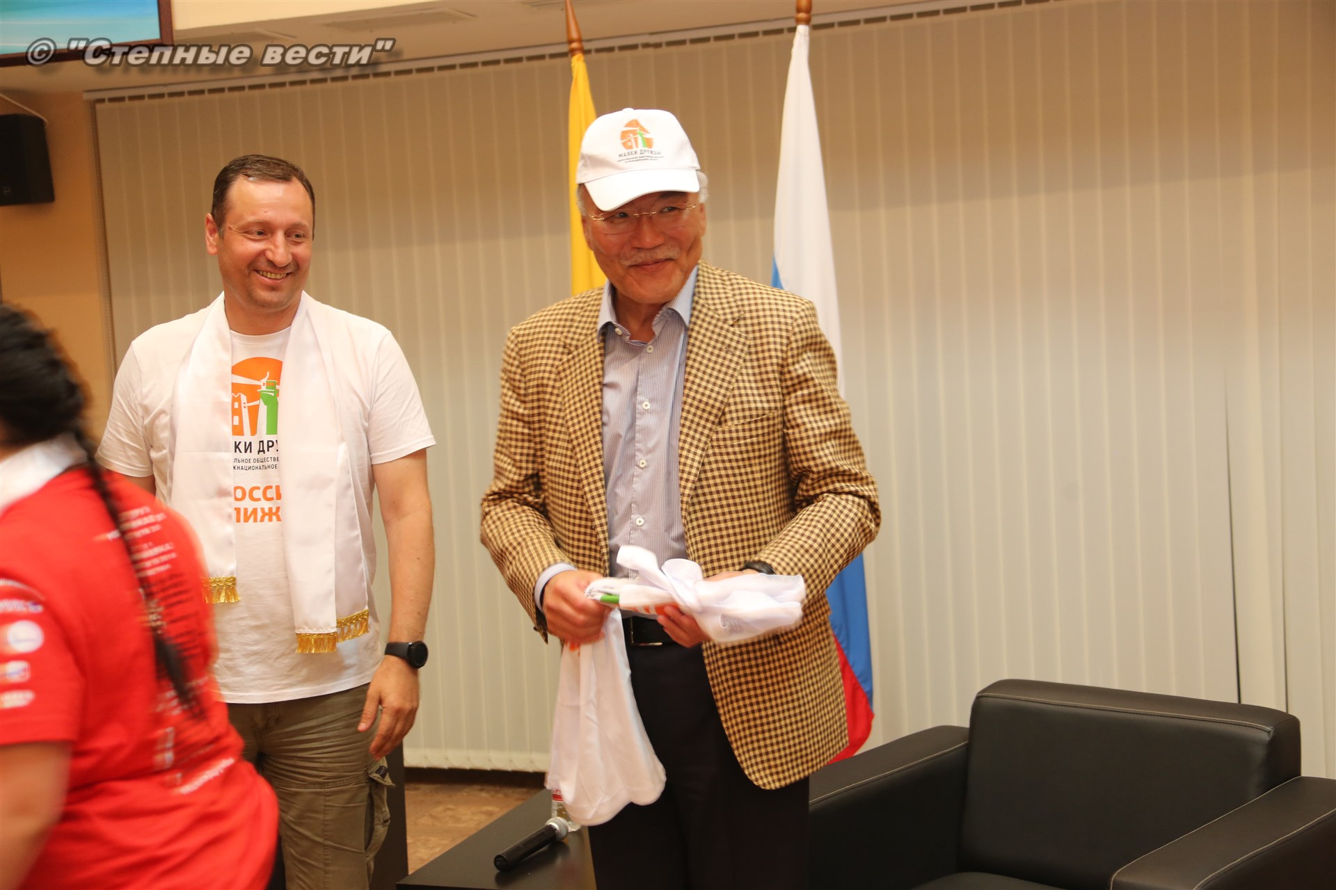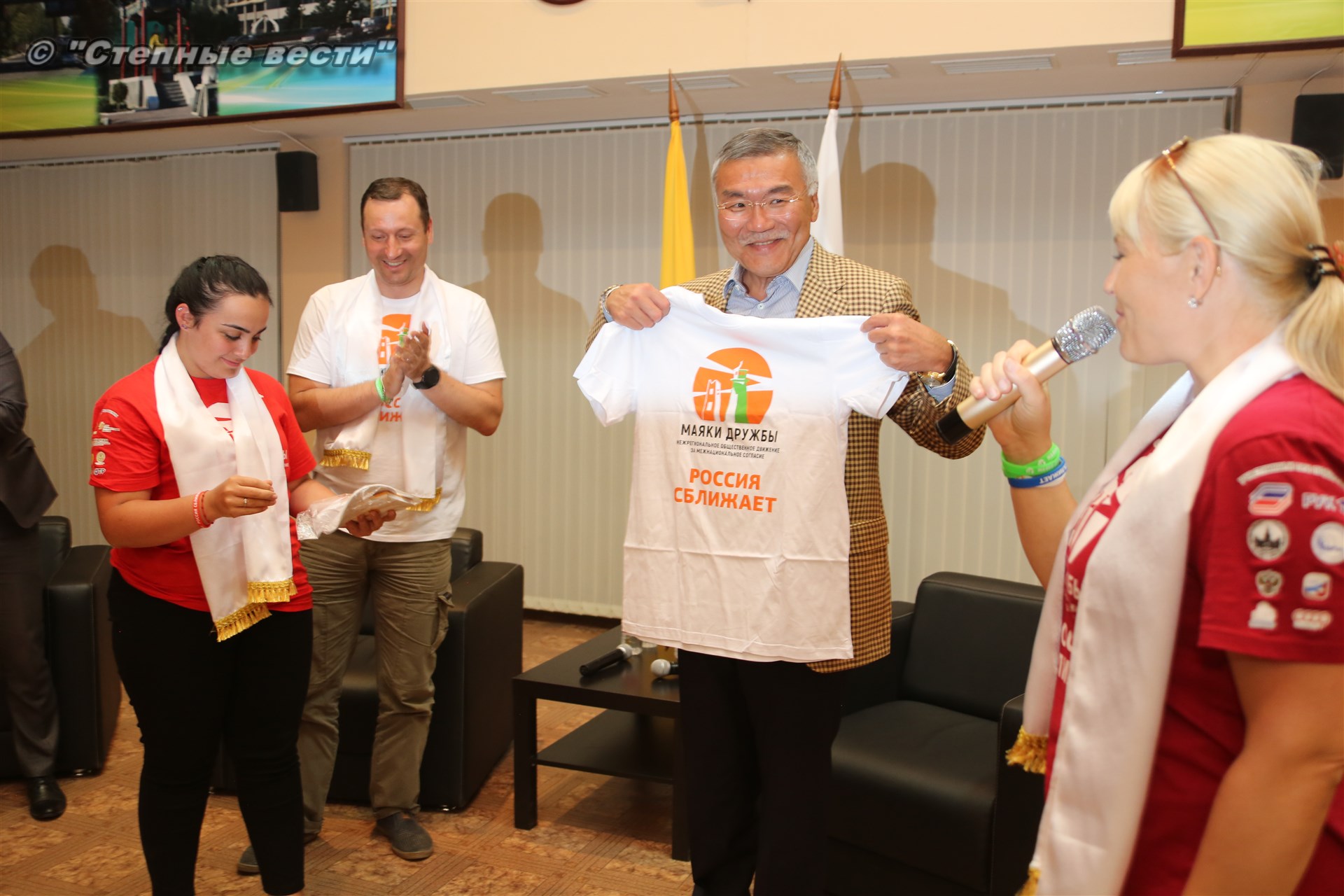 И под занавес мероприятия Главу Калмыкии Алексея Орлова все же посвятили в волонтеры, вручив специальные атрибуты с символикой проекта «Маяки дружбы. Россия сближает»-2018.