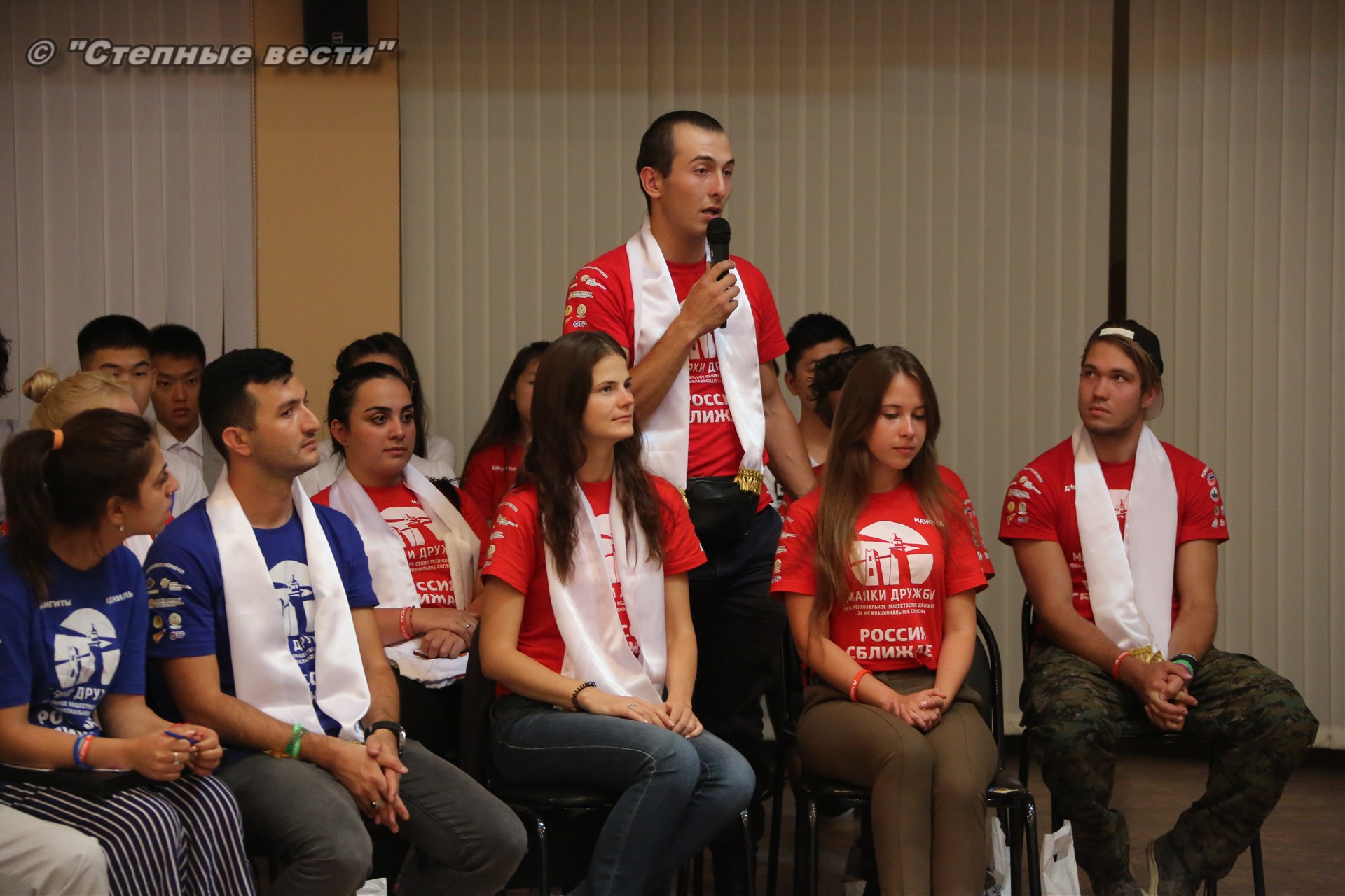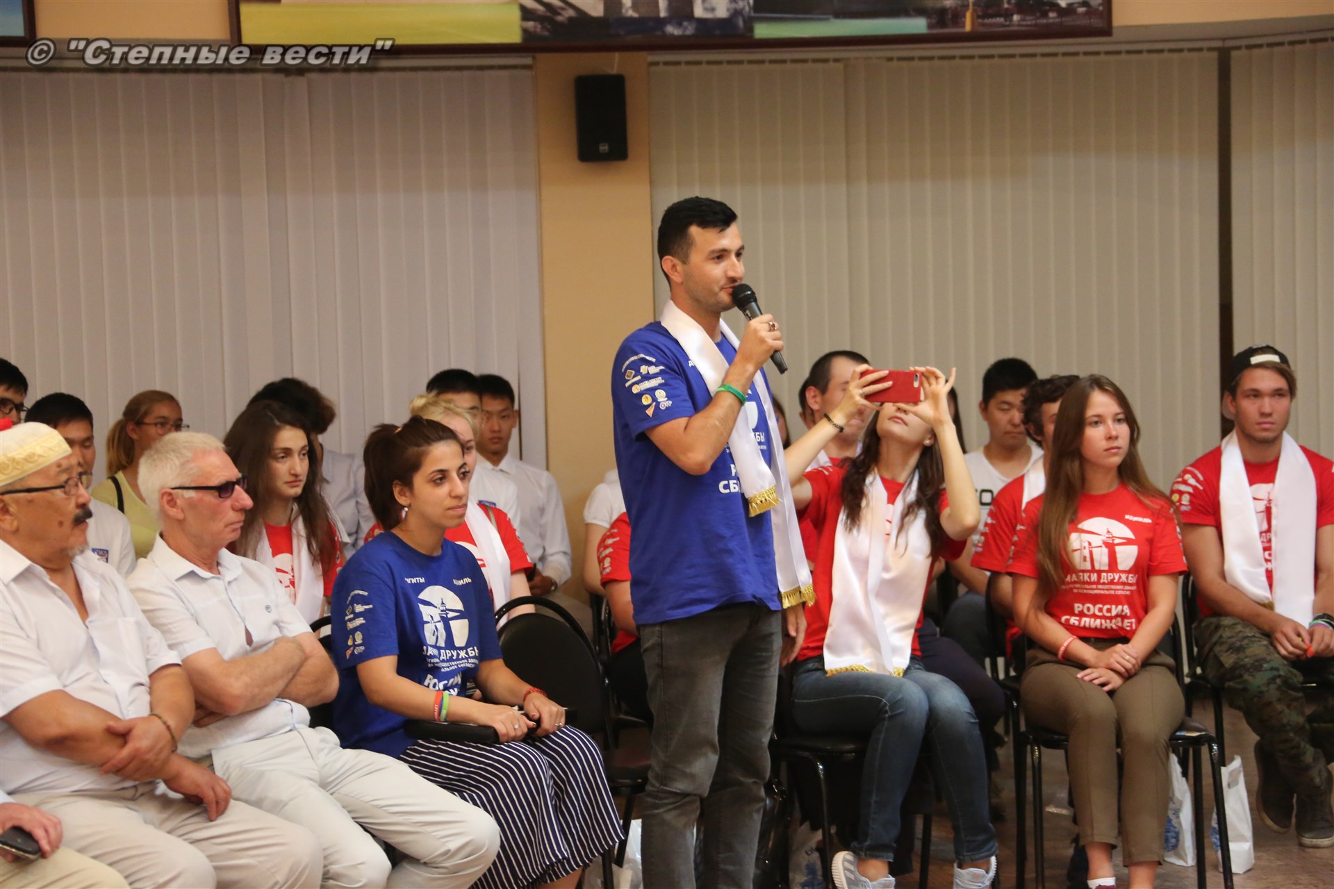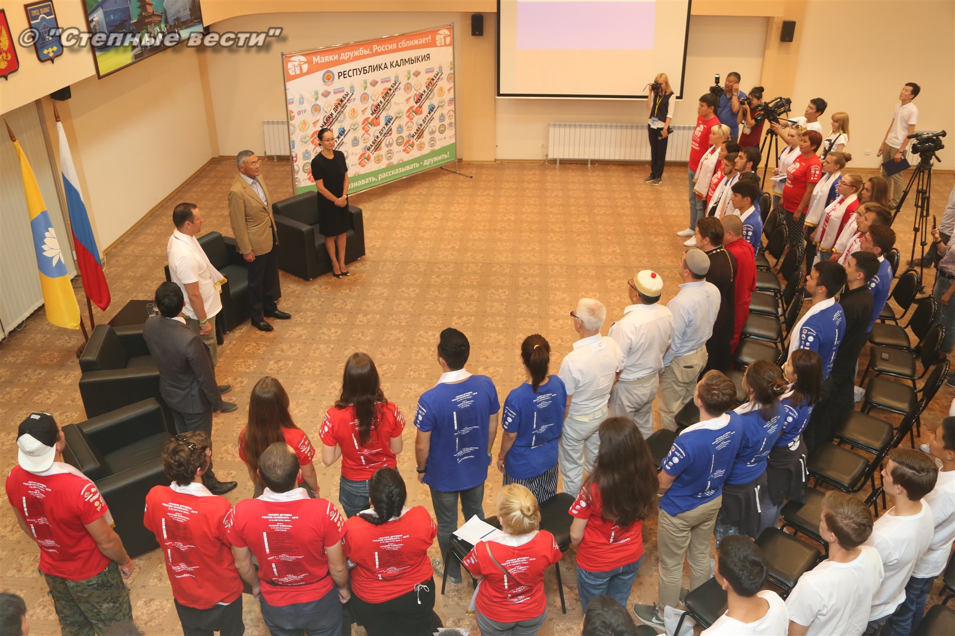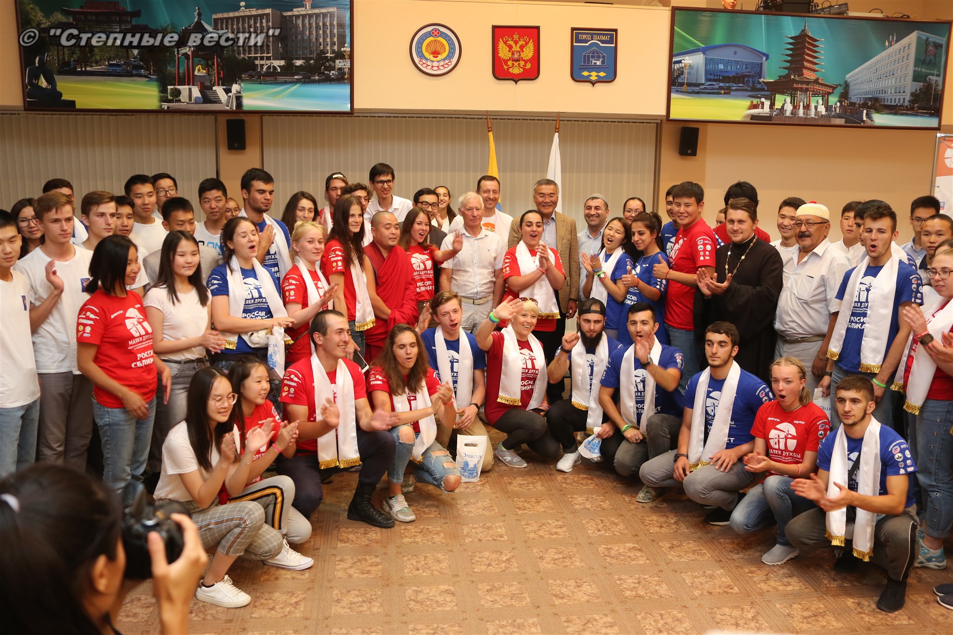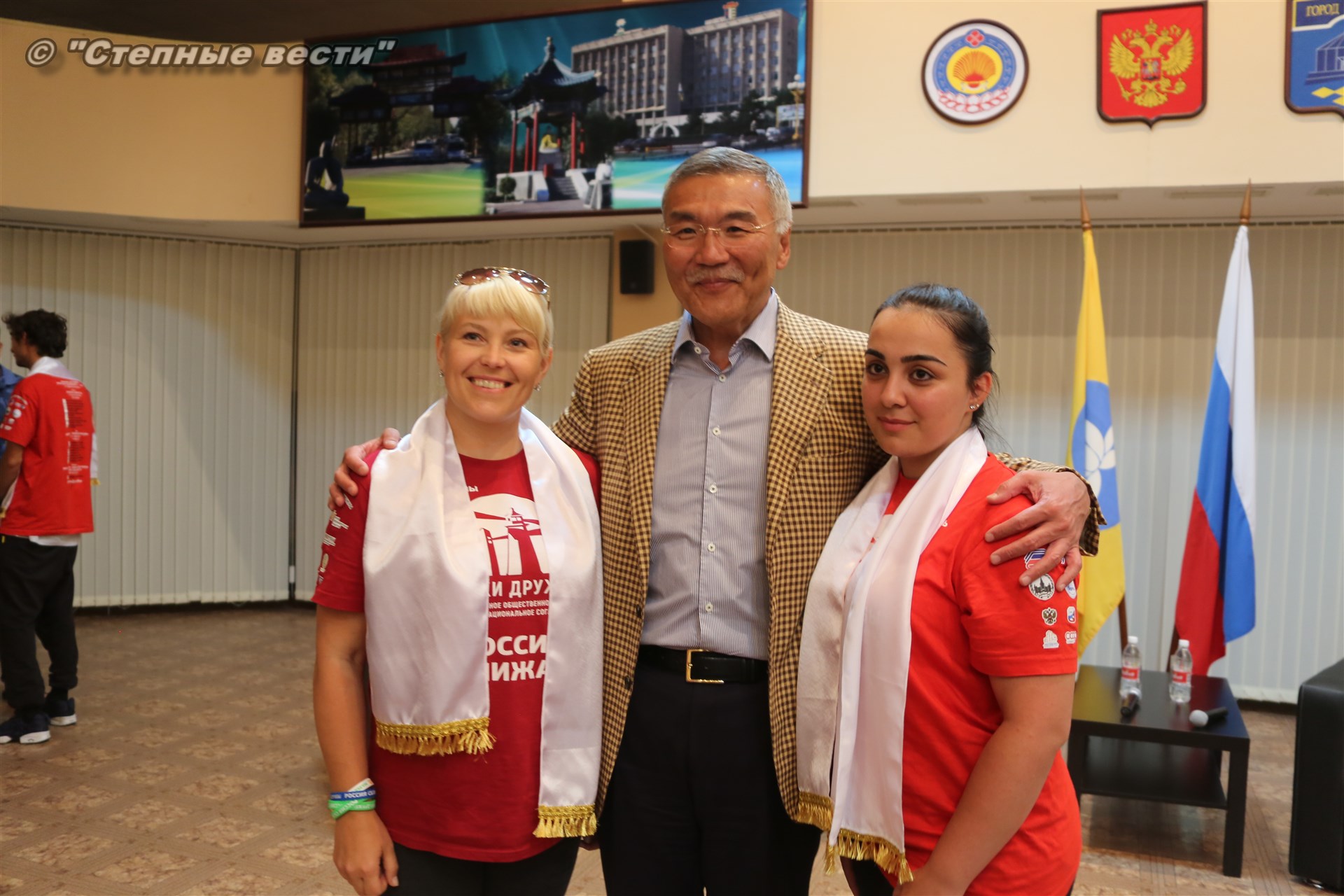 Во Дворце шахмат Сити чесс Глава Калмыкии Алексей Орлов встретился с участниками молодежного проекта межнационального согласия «Маяки дружбы. Россия сближает»-2018, который реализуется с 3 июля по 18 августа на территории регионов Северо-Кавказского и Поволжского федеральных округов России.