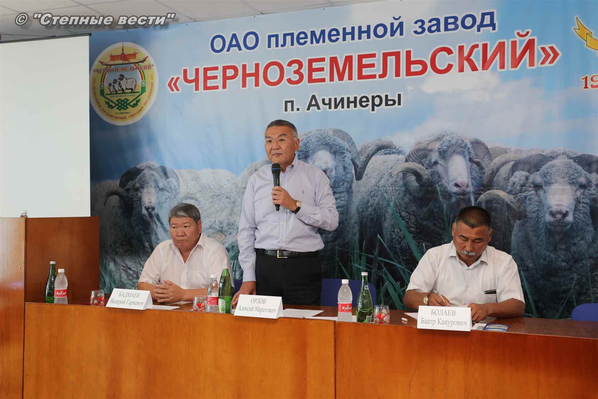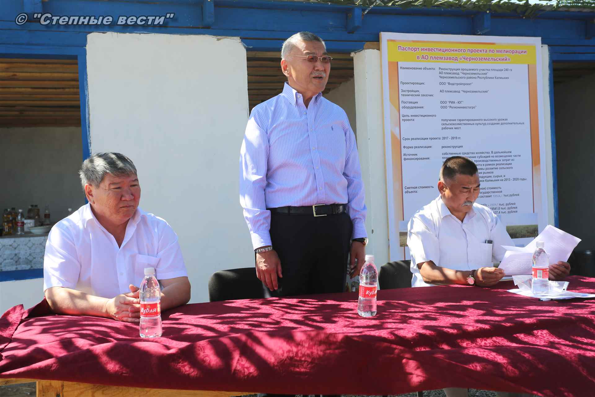 Из Адыка далее кортеж Главы РК проследовал в сторону поселка Ачинеры, где по программе значился осмотр производственных объектов АО «Племенной завод «Черноземельский». Первым делом Алексея Орлова и приехавших для знакомства с опытом по развитию кормопроизводства этого хозяйства руководителей муниципалитетов и специалистов АПК значился осмотр базы кормопроизводства предприятия. Как сообщил гендиректор АО Доля Лукшанов, в 2017 году в целях реализации поручений Главы РК и в рамках ФЦП «Развитие мелиоративных земель сельскохозяйственного назначения России на 2014-2020 годы» племзаводом была проведена работа по реконструкции орошаемого участка на площади 240 га. Для обеспечения его полива была сдана в эксплуатацию  дождевальная машина «Ахтуба». Общие затраты на запуск агрегата, включая стоимость машины, составили 8, 8 млн рублей. В 2018 году дополнительно приобретена еще одна машина австрийской фирмы «Бауэр» стоимостью 8,1 млн рублей, которая охватывает поливом площадь в 80 га.