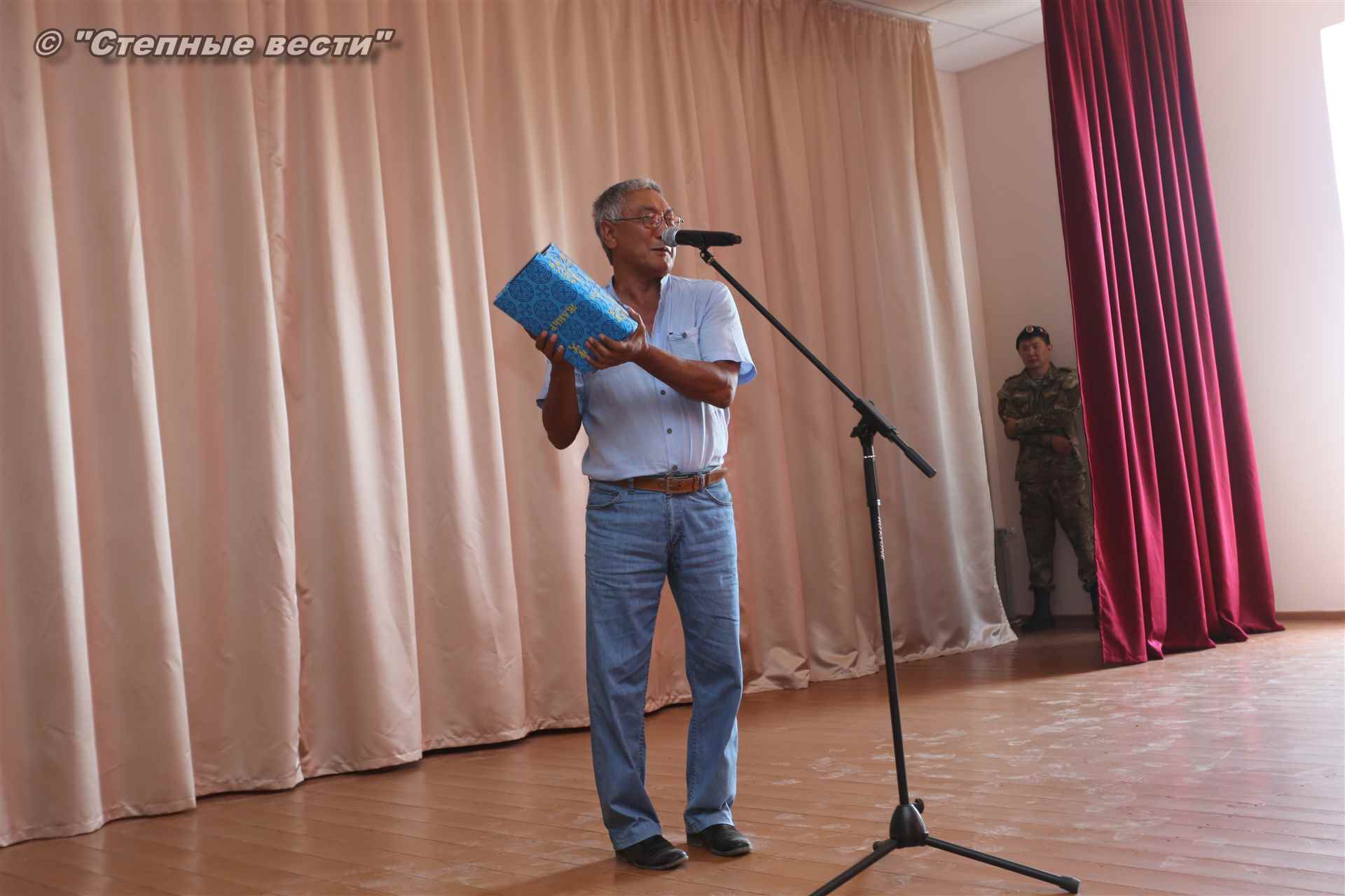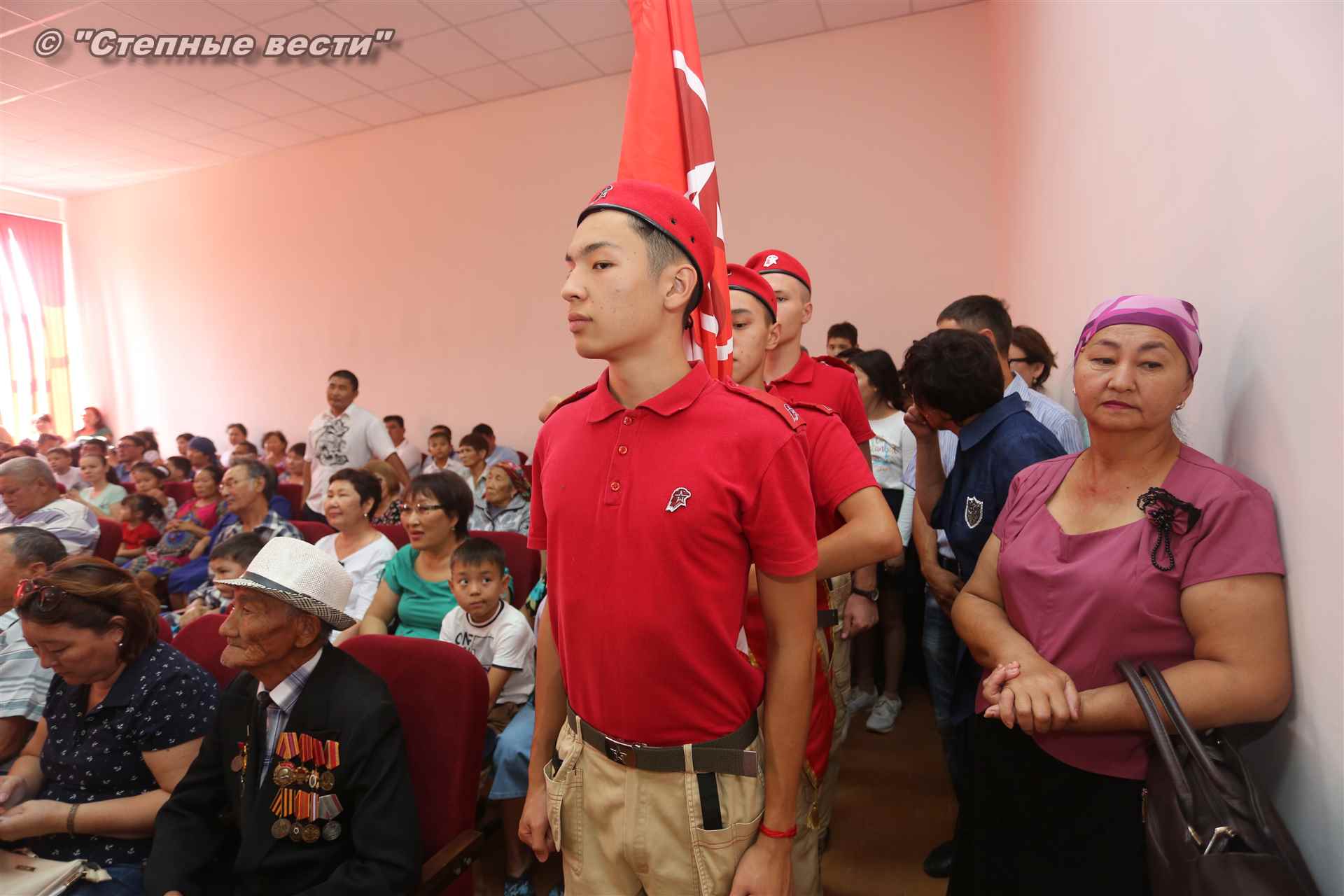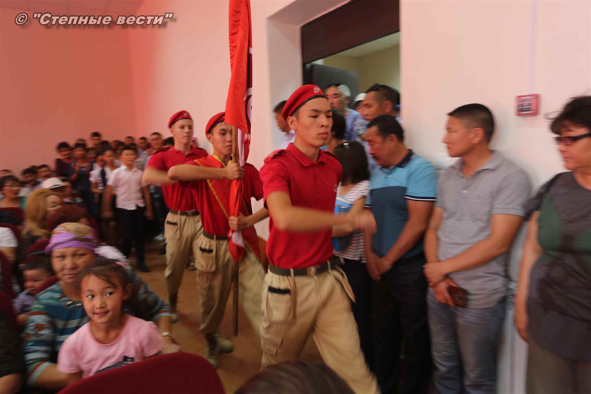 Помимо этого на сцену вышли участники еще одного мероприятия – торжественной церемонии принятия присяги в ряды юнармейцев с выносом флага патриотической организации. Десять новобранцев из числа учащихся 5-9 классов Бергинской средней общеобразовательной школы дали присягу и произнесли клятву под руководством и.о. начальника регионального штаба «Юнармия» Чимида Джангаева.