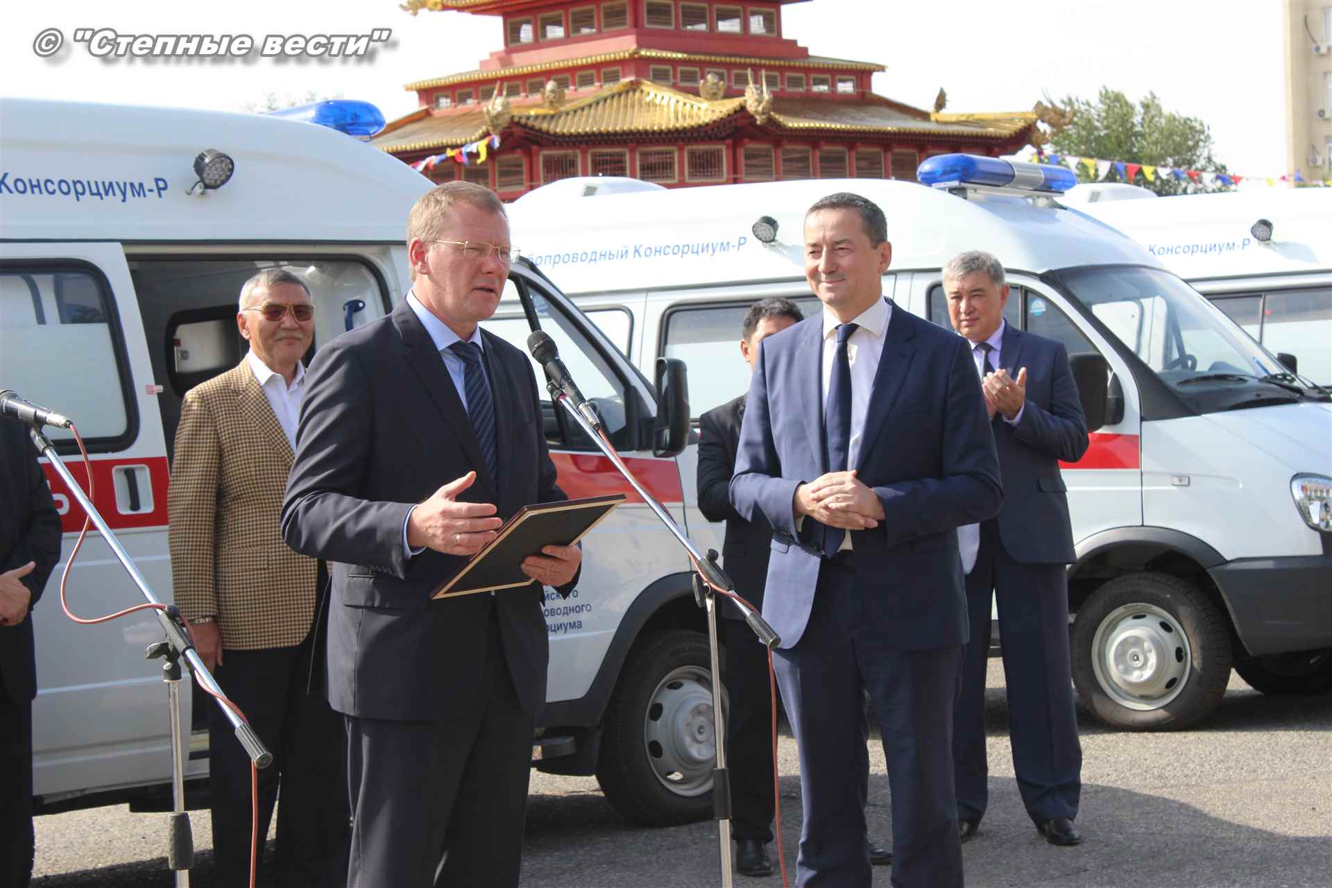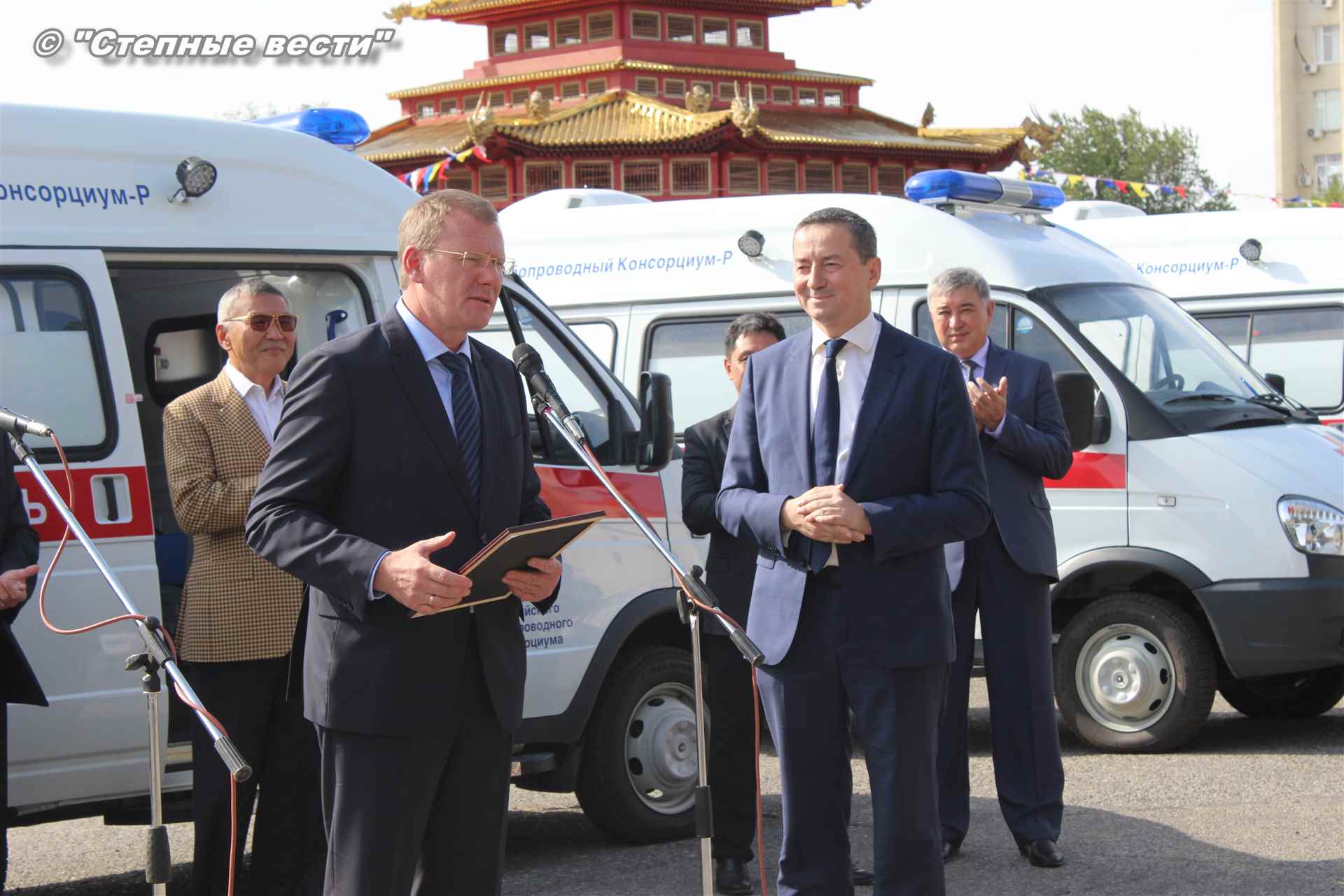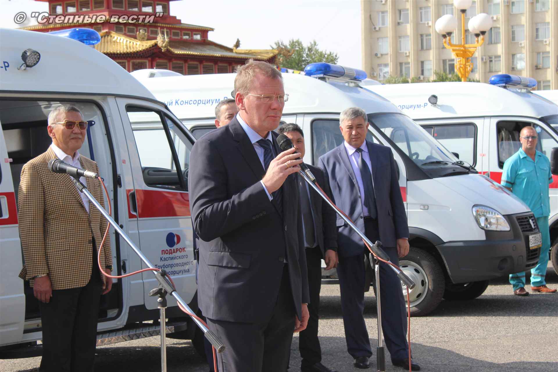 Церемония вручения ключей от новых автомобилей, на которых медработники будут выезжать к тем, кто срочно нуждается в их помощи, прошла сегодня близ территории культурного комплекса «Пагода Семи дней» в степной столице. В ней приняли участие генеральный директор Каспийского трубопроводного консорциума Николай Горбань, его первый заместитель по вопросам эксплуатации Дэннис Фэйи, заместитель генерального директора АО «КТК-Р» по связям с Правительством РФ Михаил Гришанков, Председатель Правительства РК Игорь Зотов, вице-премьер РК Боова Бадмаев, министр здравоохранения РК Юрий Кикенов, работники здравоохранения, студенты медицинского колледжа.