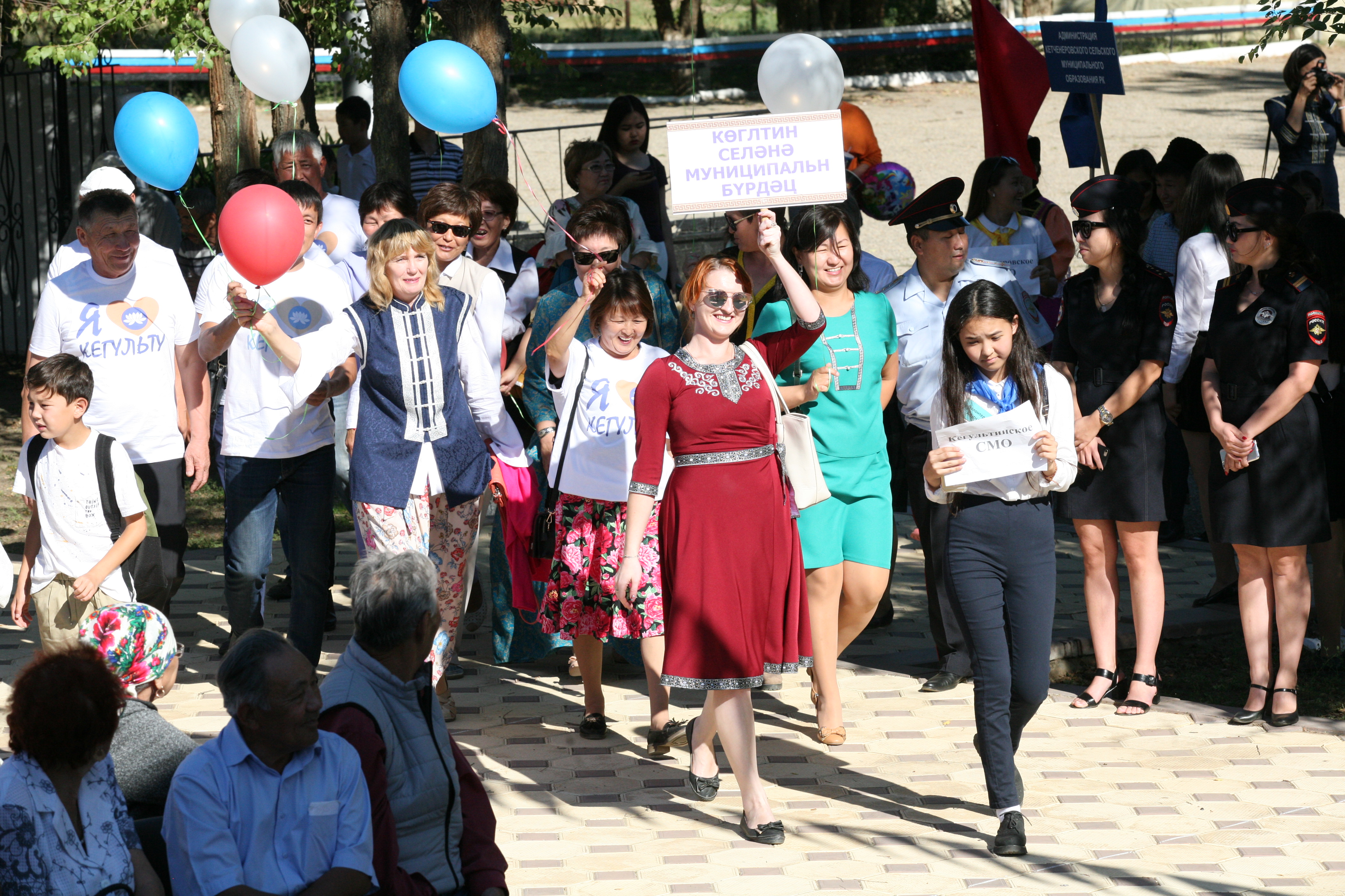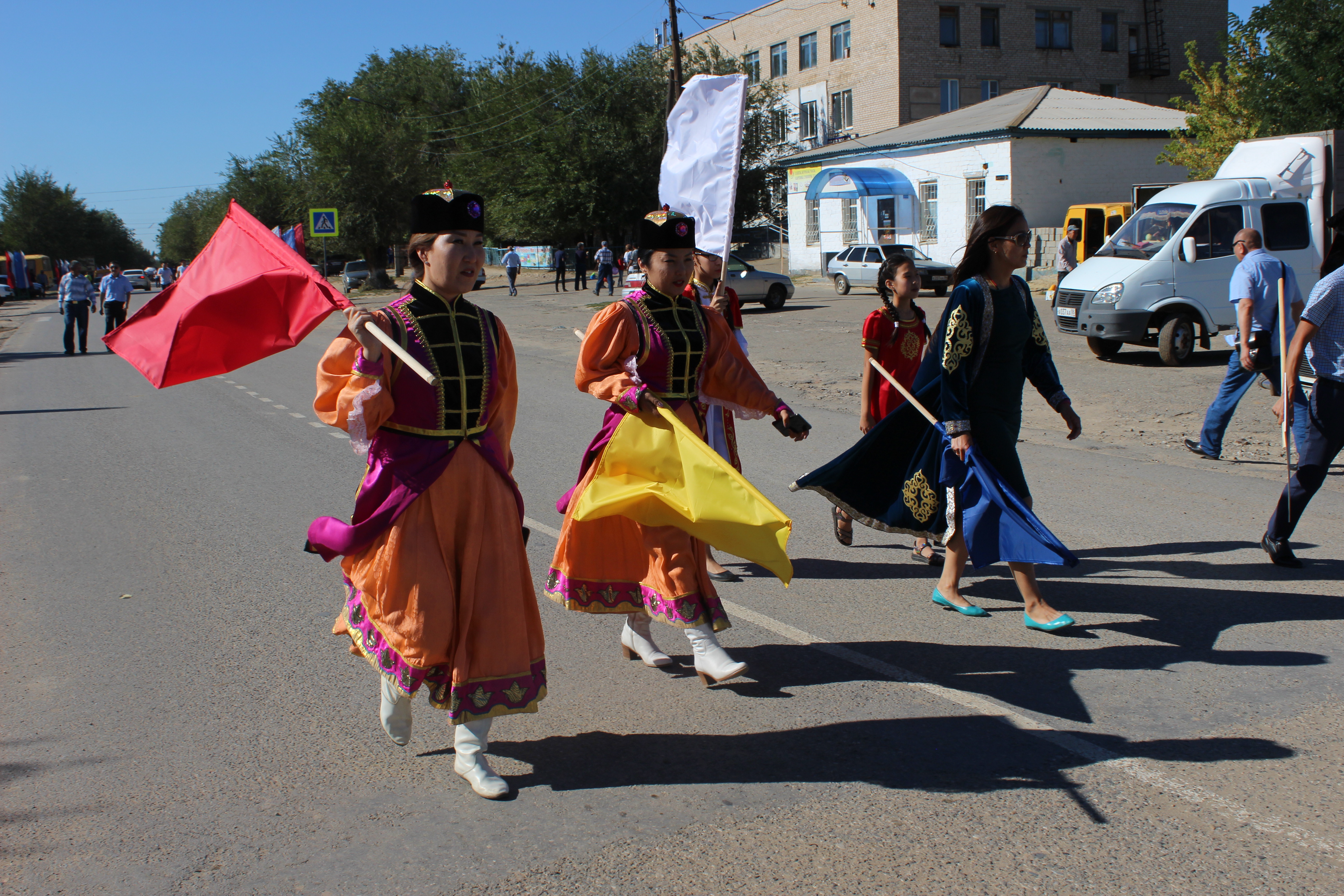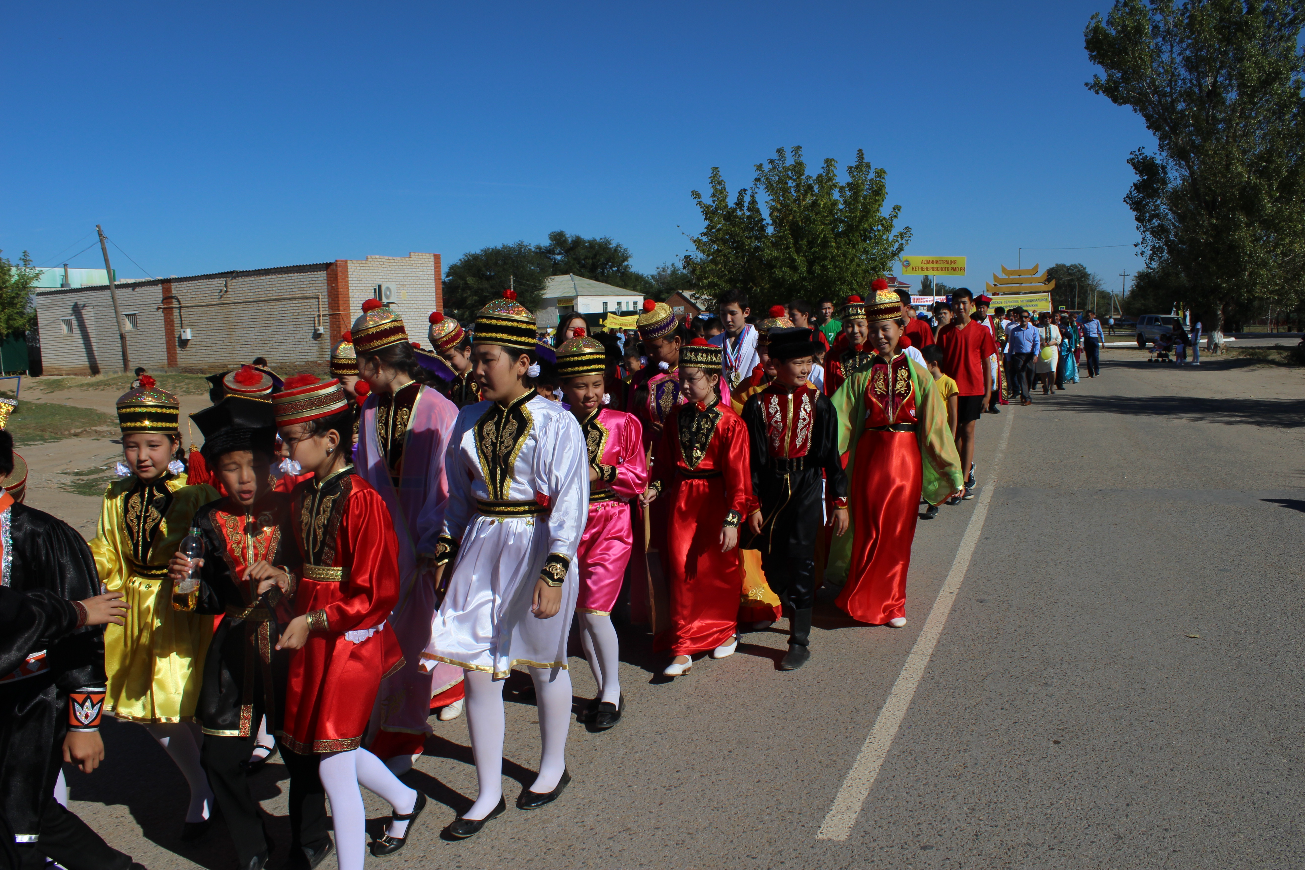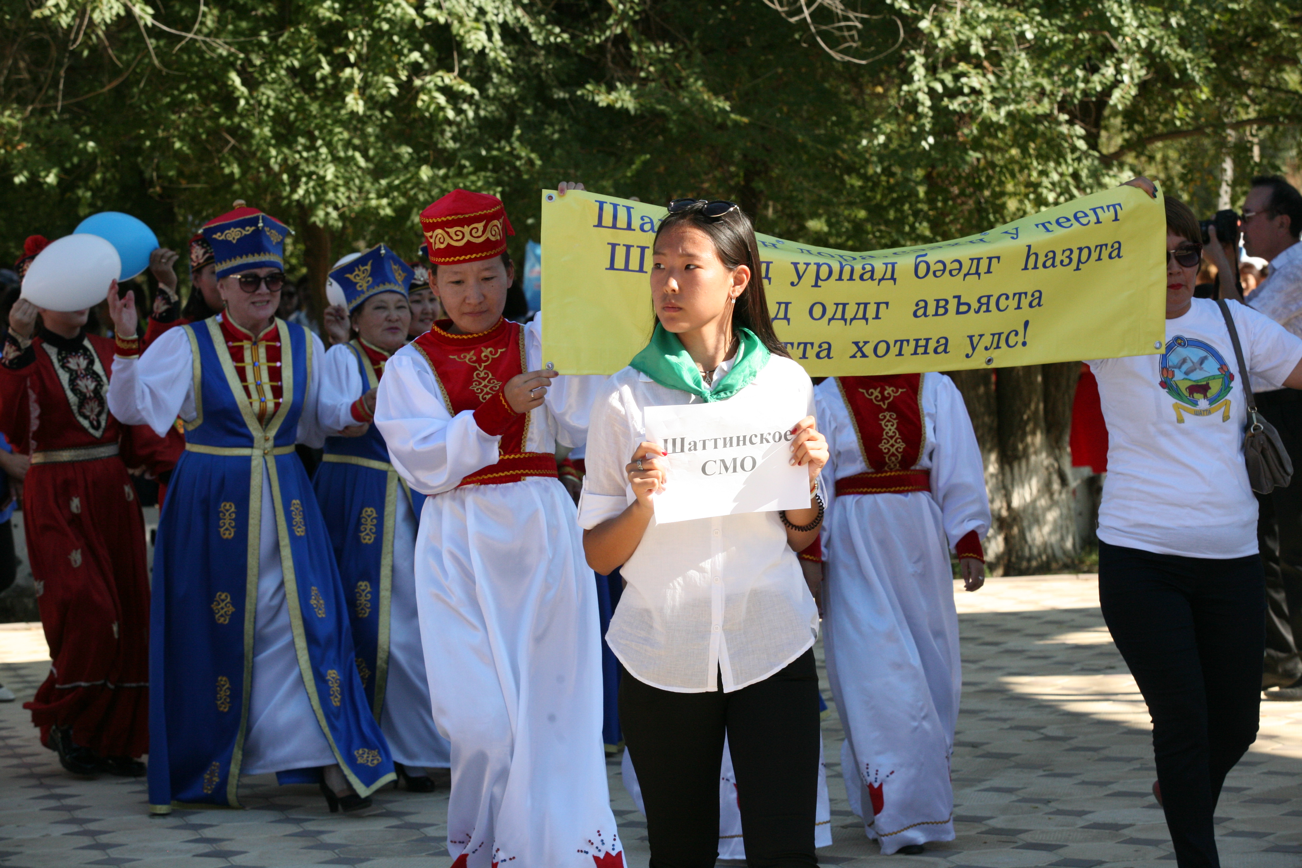 По окончании скачек, в 13.30, в центре Кетченер началась подготовка к праздничному шествию-смотру колонн поселений, организаций и учреждений района. Участники делегаций были одеты в пошитые специально к празднику национальные костюмы и нарядные платья в калмыцком стиле и шли с красочно оформленными транспарантами и праздничной атрибутикой. Все это смотрелось здорово!