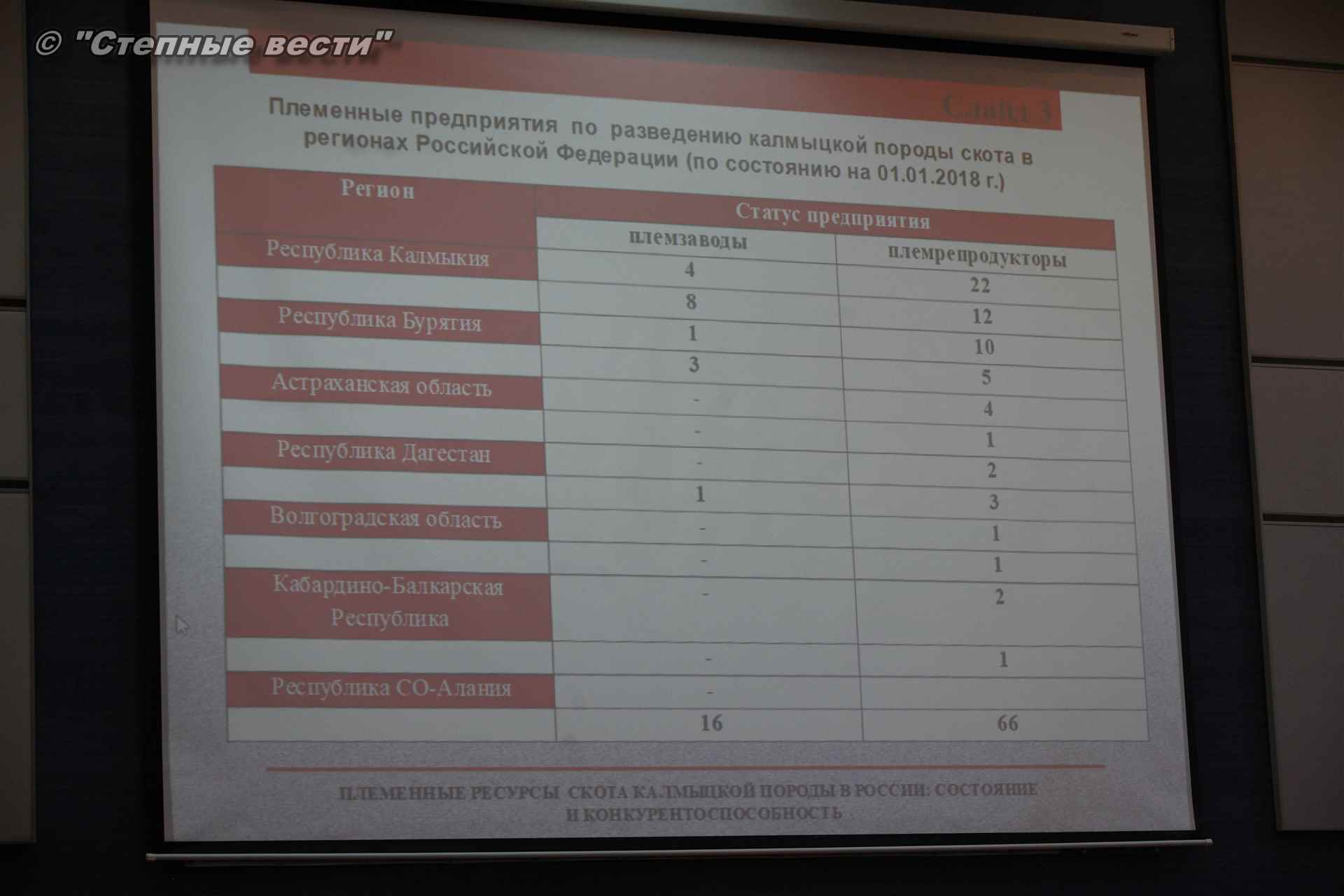 Развитием племенного поголовья КРС в Калмыкии занимаются 26 организаций, в том числе четыре племенных завода и 22 племрепродуктора. Численность племенного КРС калмыцкой породы в регионе на сегодняшний день составляет 56,8 тыс. голов, в том числе 24,4 тыс. коров. В 2017 году реализовано 3197 голов племенного молодняка КРС, в текущем году, предварительно, планируется реализовать около 4 тыс. бычков и телочек.