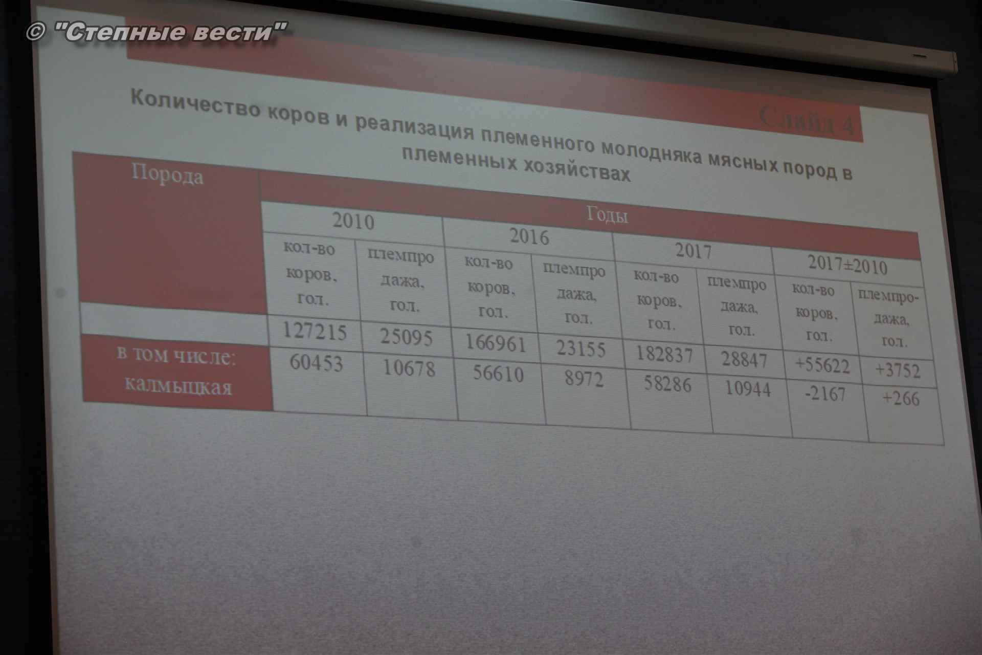 С основным докладом о состоянии отрасли животноводства в Калмыкии и перспективах ее развития выступил первый заместитель министра СХ РК Валерий Артаев. Он отметил, что по последним статтданным, в настоящее время поголовье крупного рогатого скота в Калмыкии в хозяйствах всех категорий составляет 532 тыс. голов, в том числе 101 тыс. – в сельхозорганизациях, 228 тыс. в крестьянско-фермерских хозяйствах и 202 тысячи в хозяйствах населения. Для сравнения: в 2008 году поголовье калмыцкого КРС насчитывало 332 тысячи голов. Максимальное количество скота в республики было зарегистрировано в 2012 году – более 600 тыс. голов.