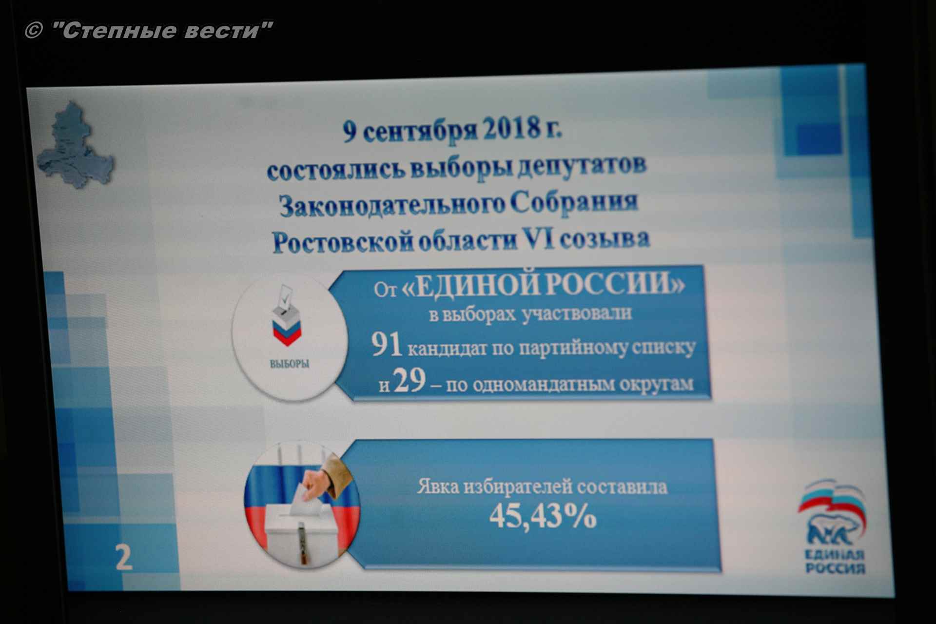 «Явка в Калмыкии составила 54,6 %, в Ростовской области — 45,5 %, это второй и третий результат в стране после Кемеровской области», — подчеркнул В. Дерябкин. Он отметил деятельность глав регионов в выборный период, в том числе руководителей Калмыкии, Ростовской, Волгоградской областей и других.