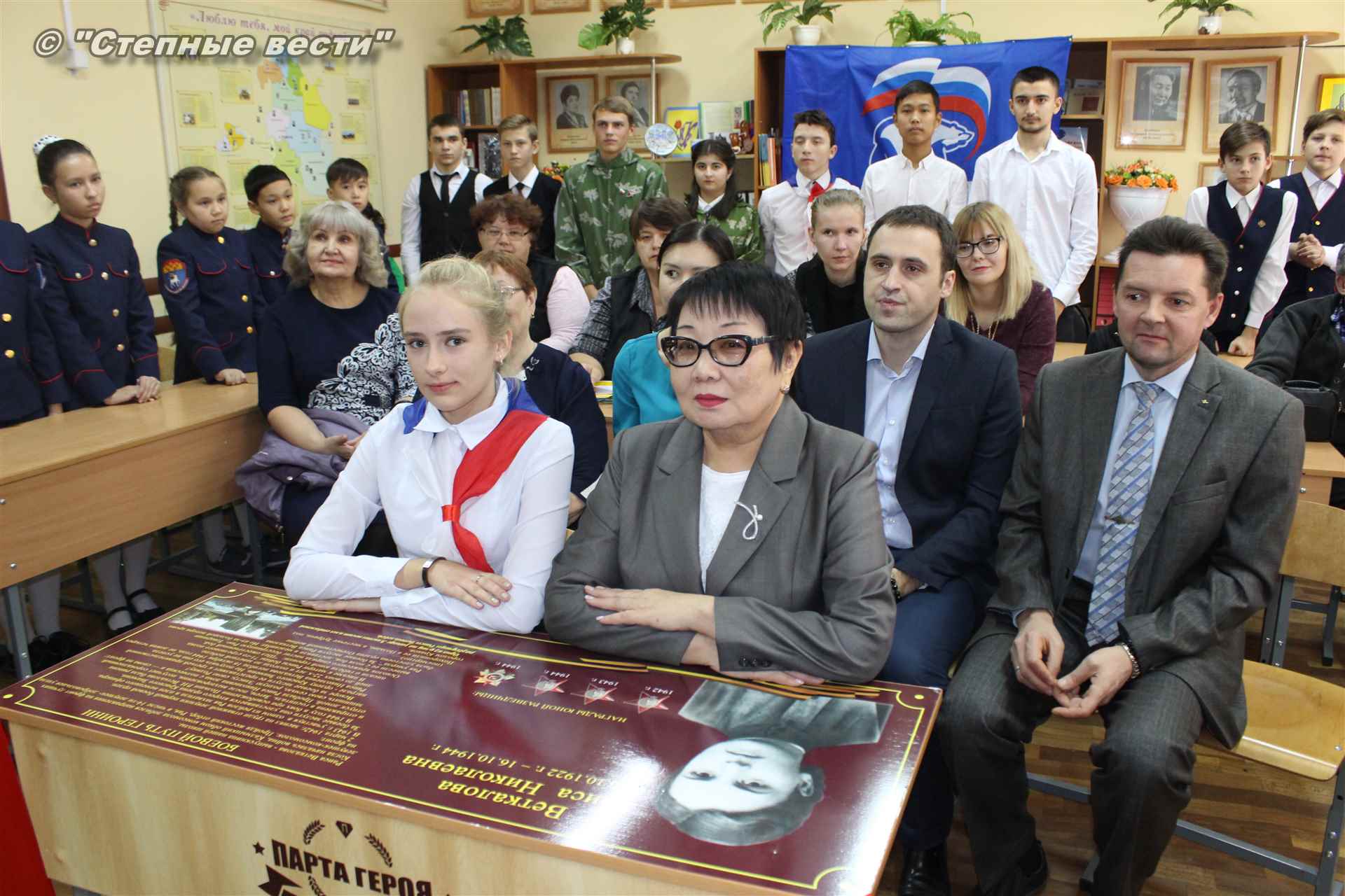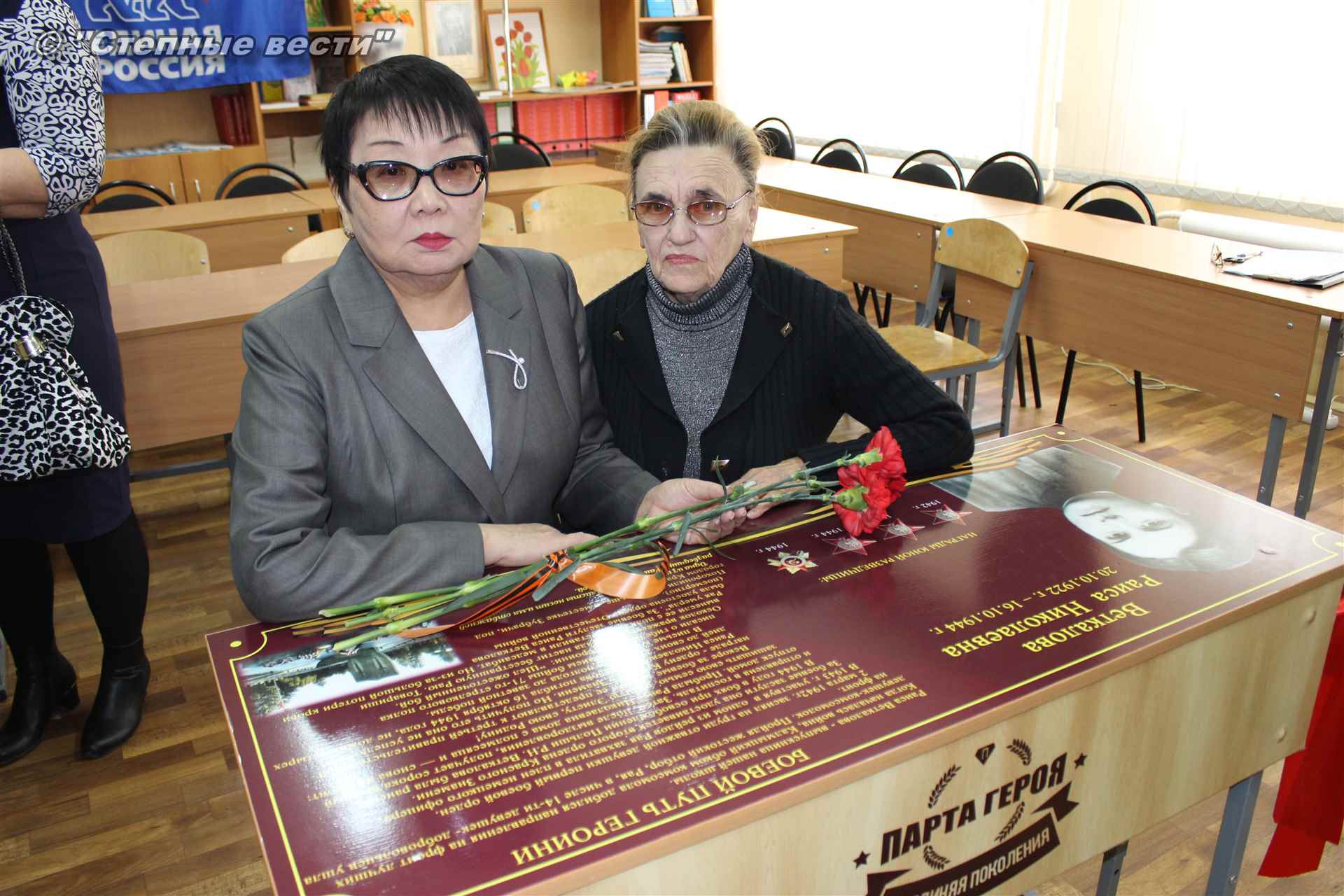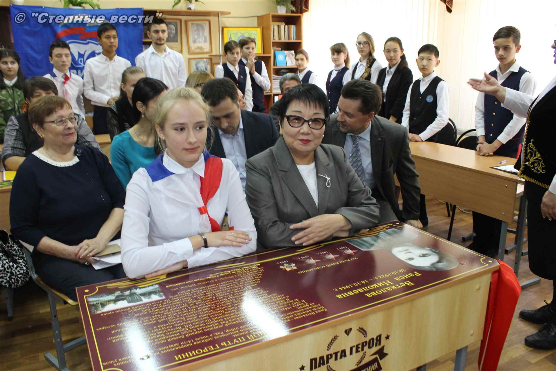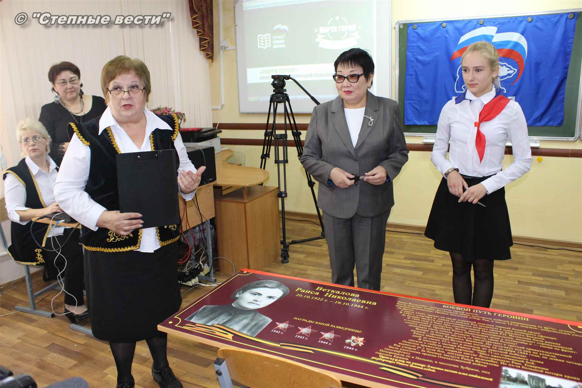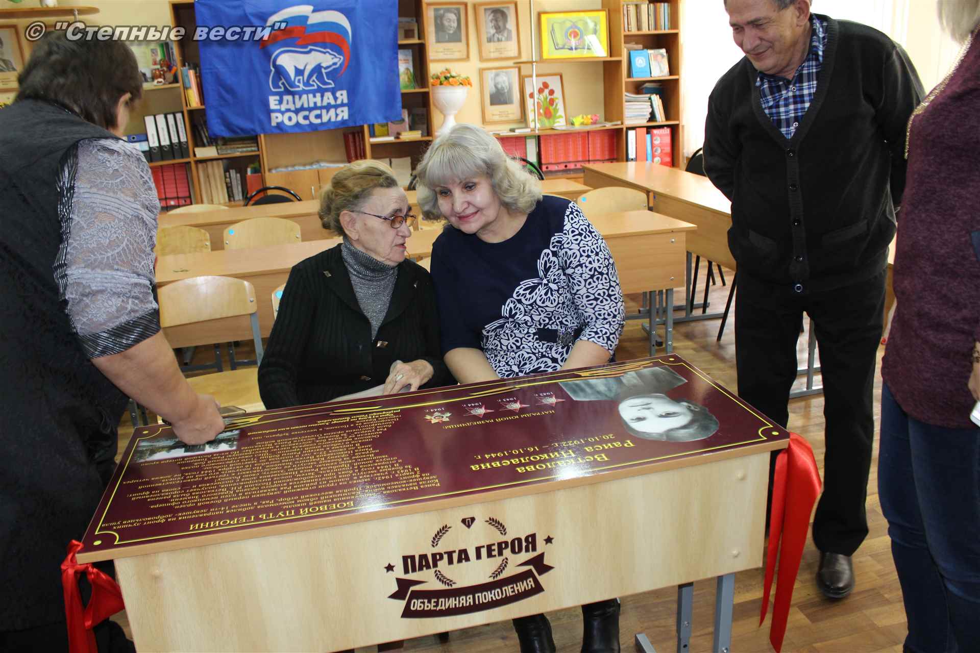 1В рамках партийного проекта «Единой России» «Новая школа» сегодня в элистинской средней школе № 2 состоялось торжественное открытие «Парты Героя», изготовленной в честь Героя Великой Отечественной войны Раисы Веткаловой, родившейся в Элисте, учившейся и работавшей до войны в этой школе.